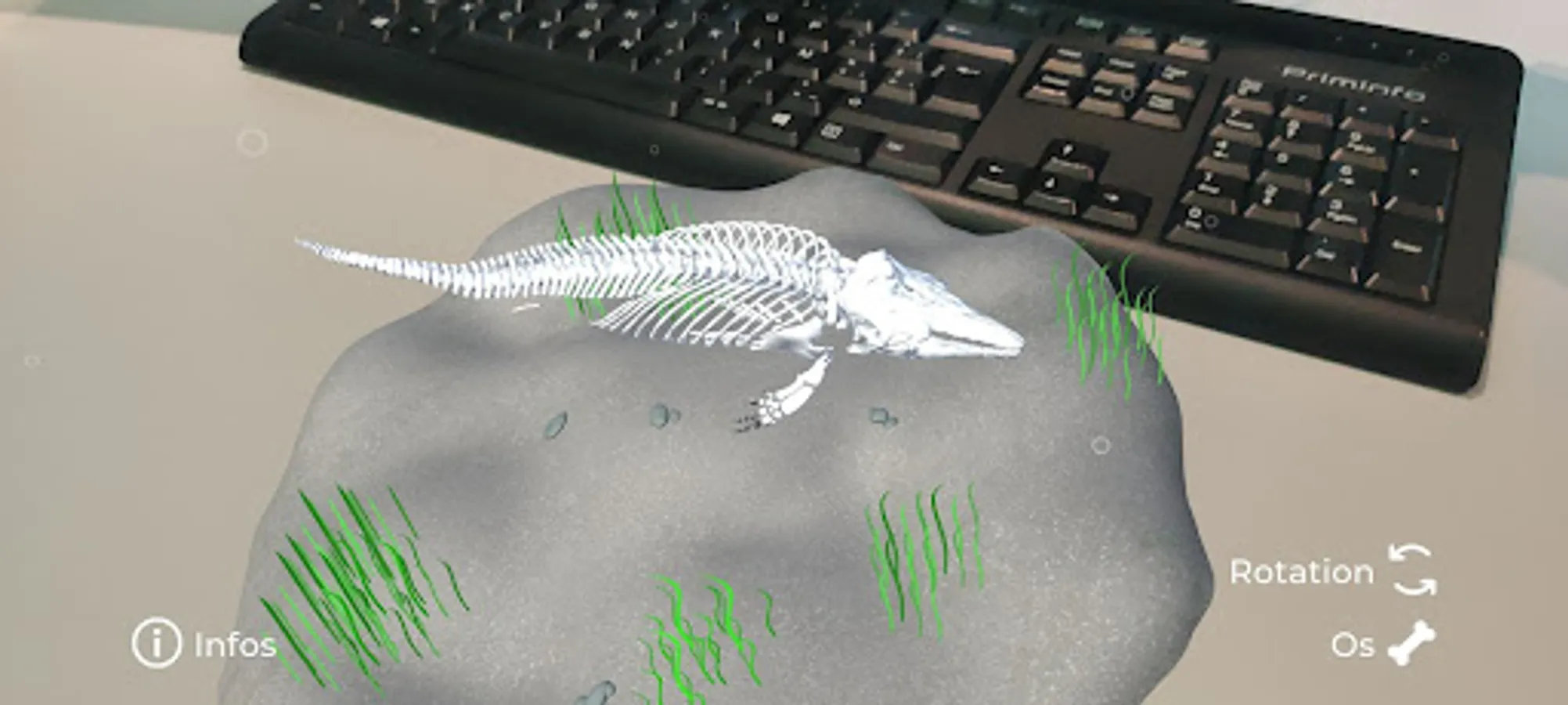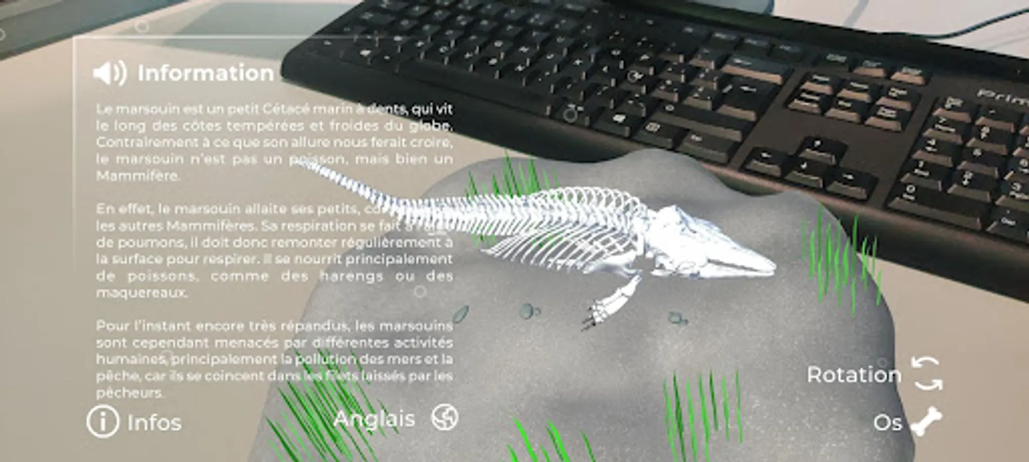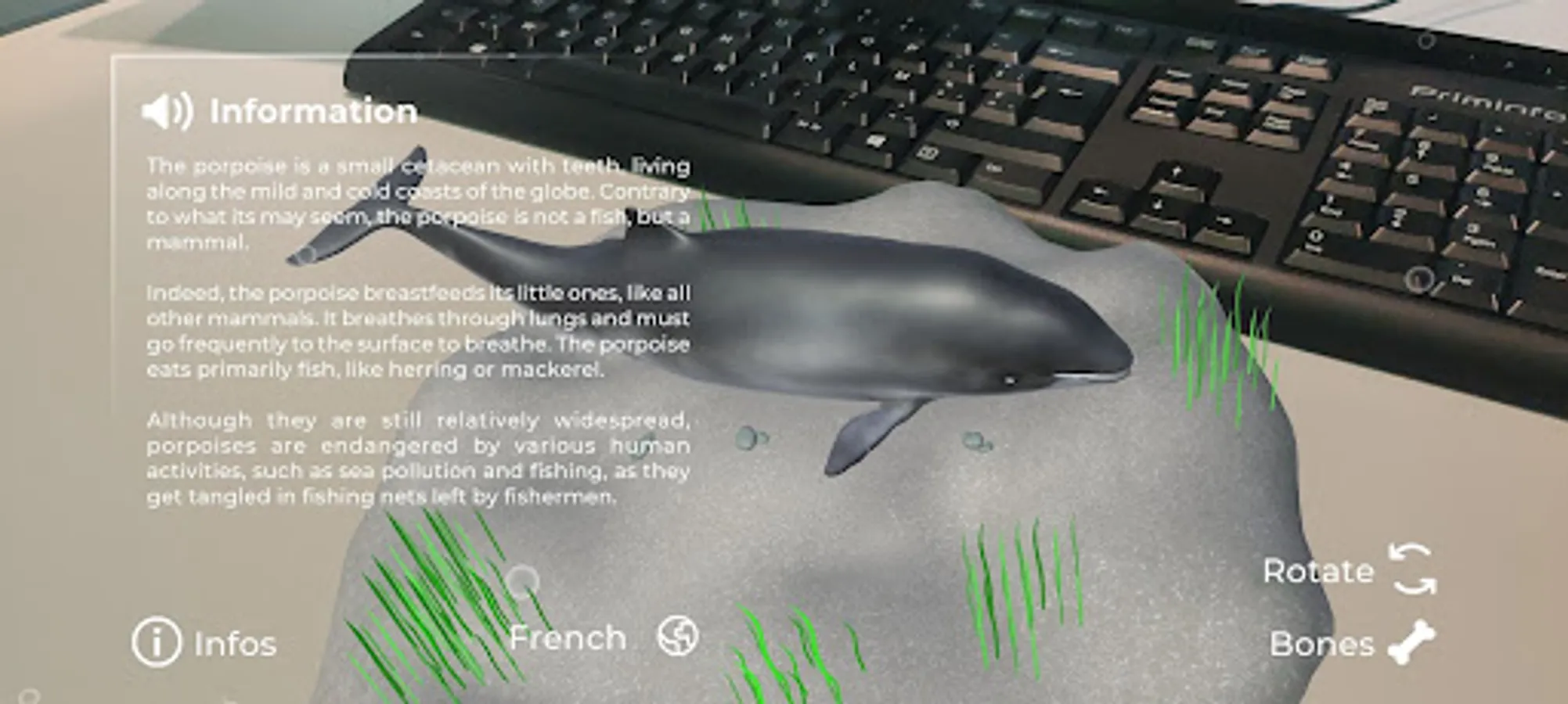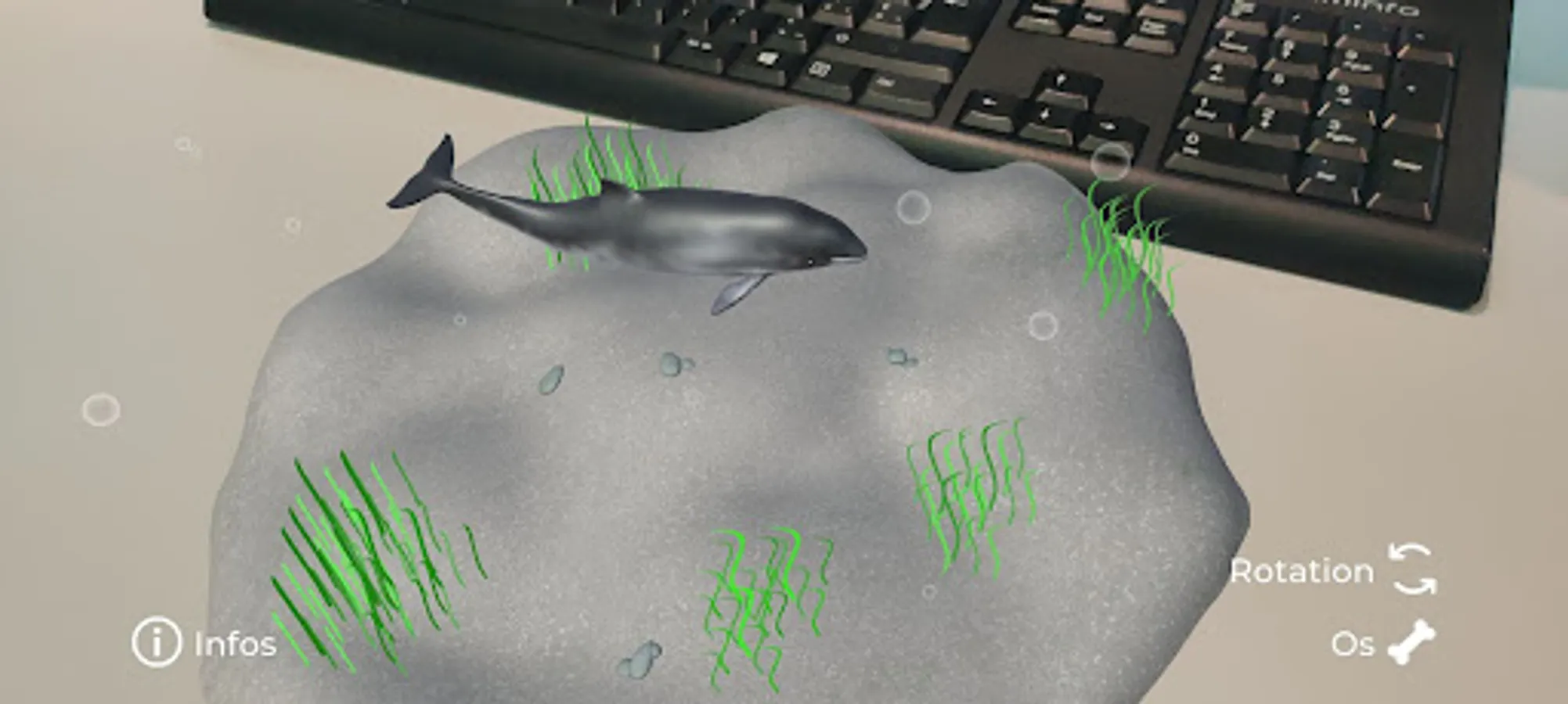 You can discover in Augmented Reality three different animated animal species: a crab, a porpoise and a fin whale.