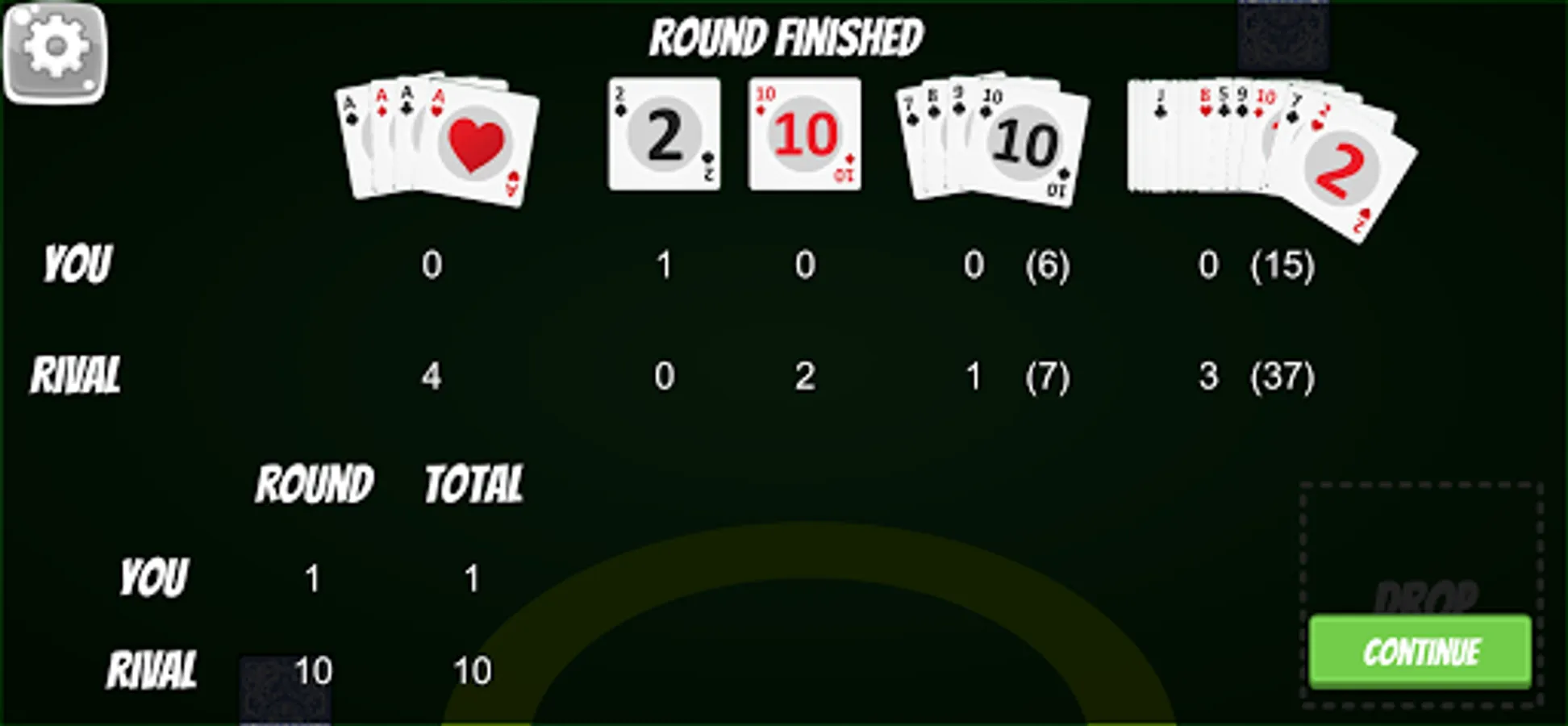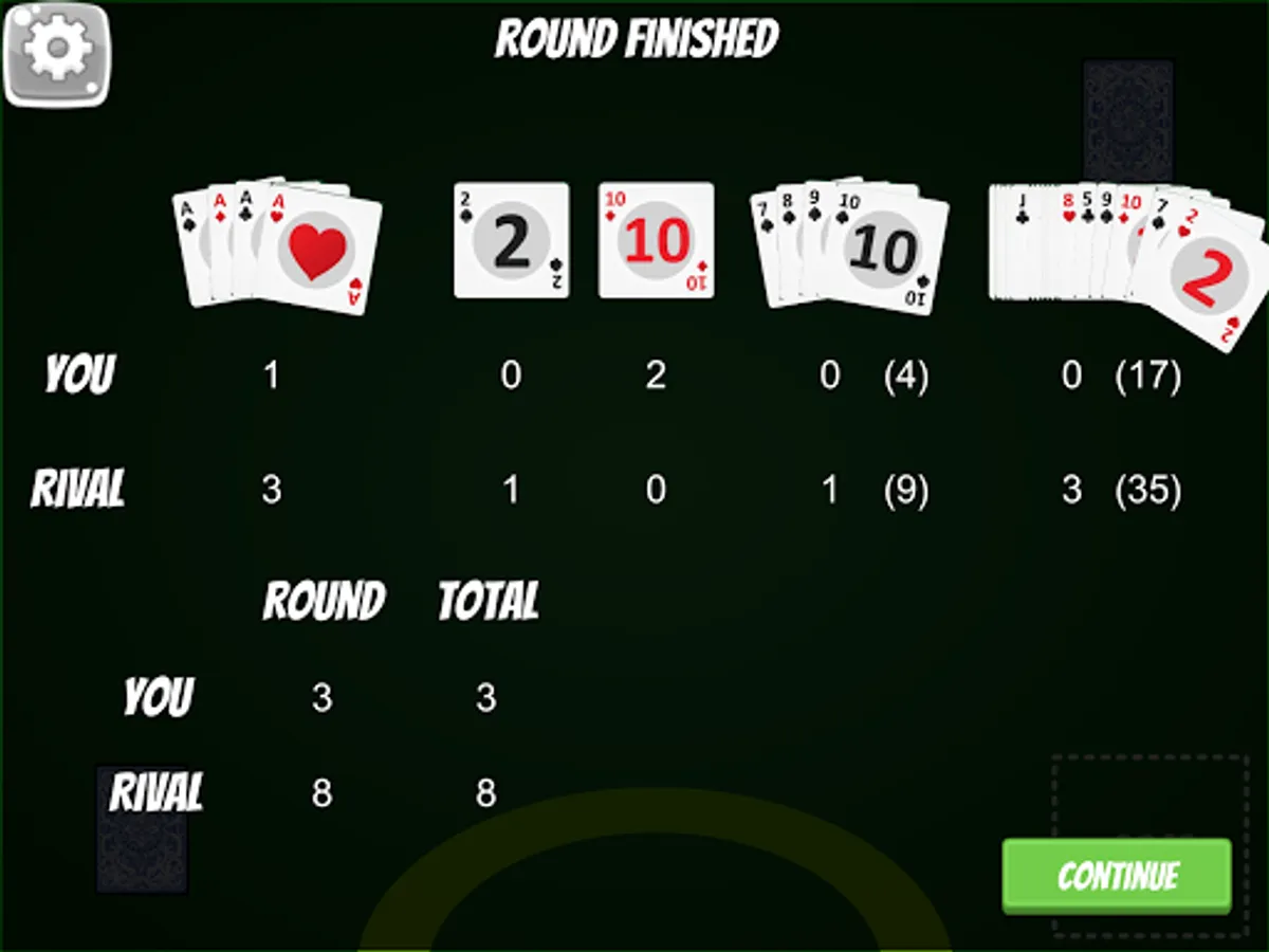 It contains all basic actions to play Cassino, you can take a card, form, drop, group and accumulate cards. Think before making each play and get smarter than the opponent!
