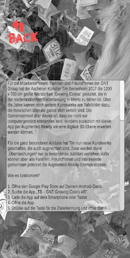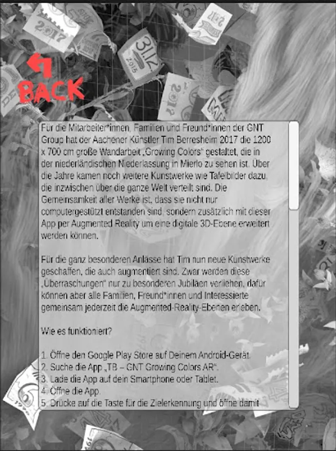 In 2017, an artist from Aachen, Tim Berresheim, created the 12x7 meter wall art “Growing Colors” for employees of the GNT Group. This wall art can be found in the lab building of the head office in Mierlo, The Netherlands. Over the years, Tim has designed various works of art for special occasions, such as enamel shields for GNT anniversaries celebrated around the world. What all artworks have in common is that they are not only made with the help of computers, but they can also be expanded to a digital 3D level via an app - using augmented reality.