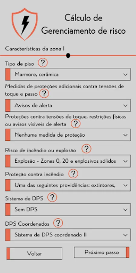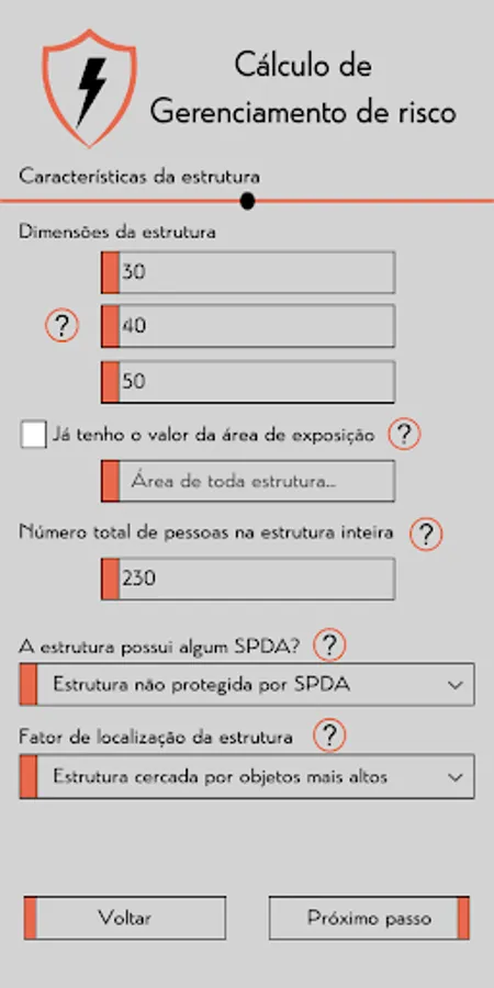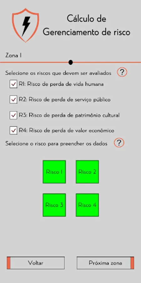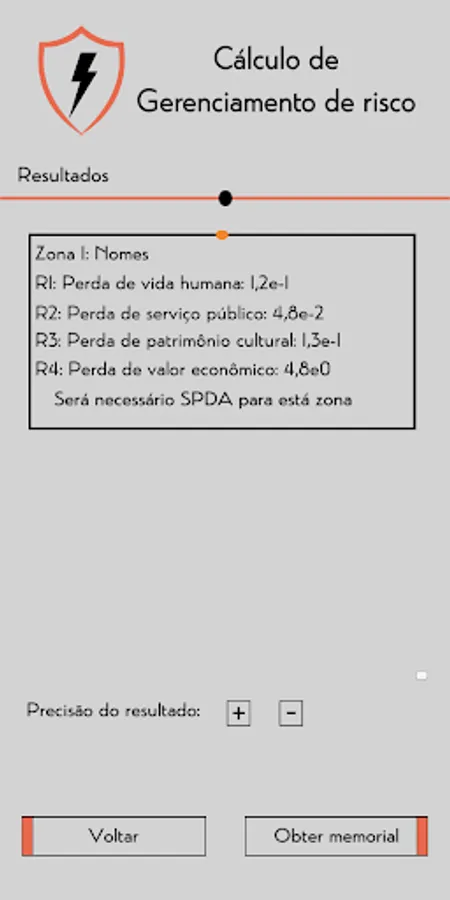 Following the concepts presented in the ABNT NBR 5419:2015 standard, the application allows you to calculate the risk management for SPDA from information on the structure and its location, analyzing the risks R1, R2, R3 and R4, being,