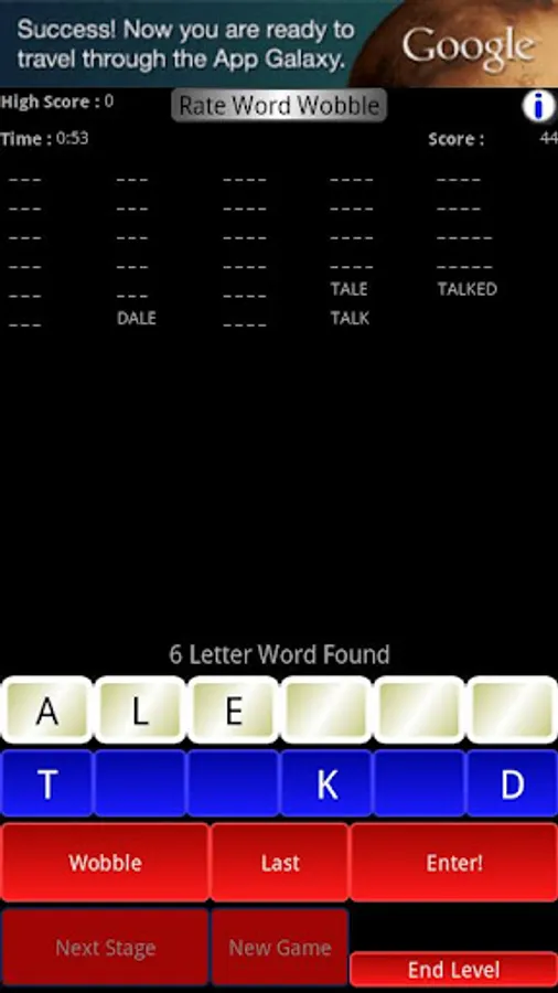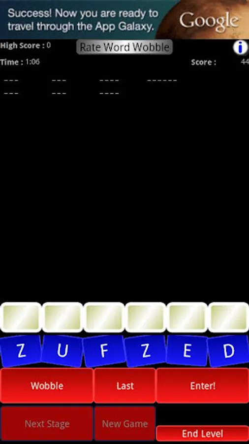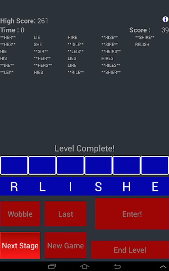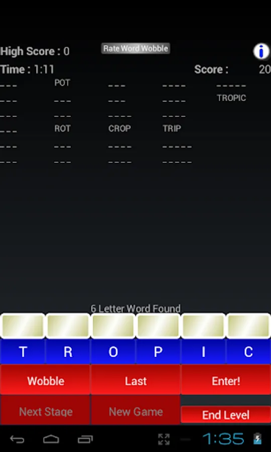 Word Wobble is a word game that presents the player with six letters with which to create as many words as possible.
