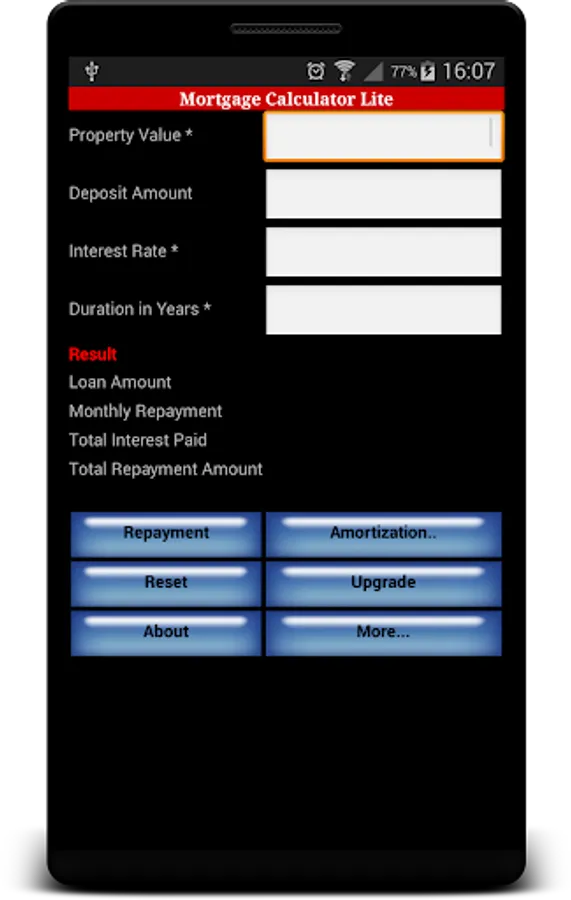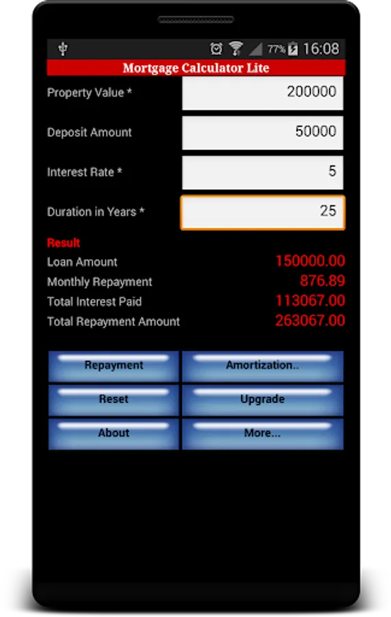 The application calculates the loan amount,monthly repayment amount,total interest paid and total repayment amount from property value, deposit amount and interest rate values entered by user.