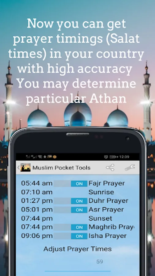 • Accurate prayer times based on your current location with multiple settings available (angles)