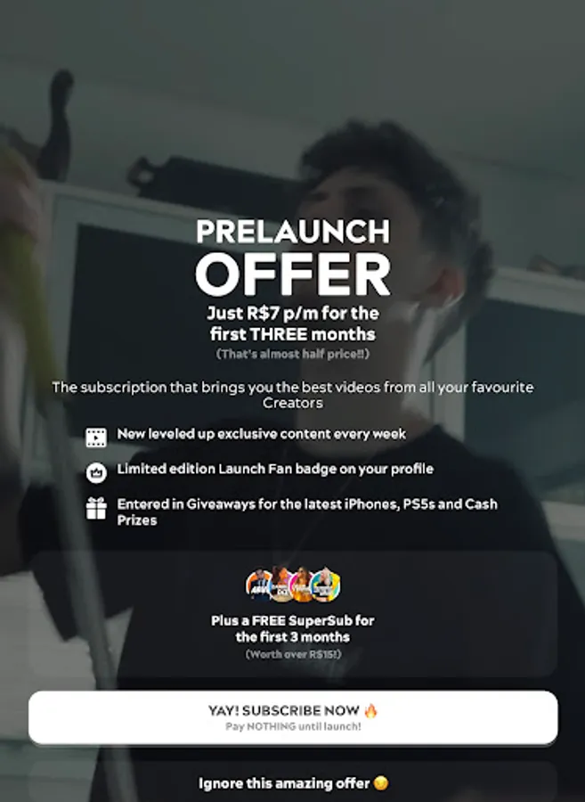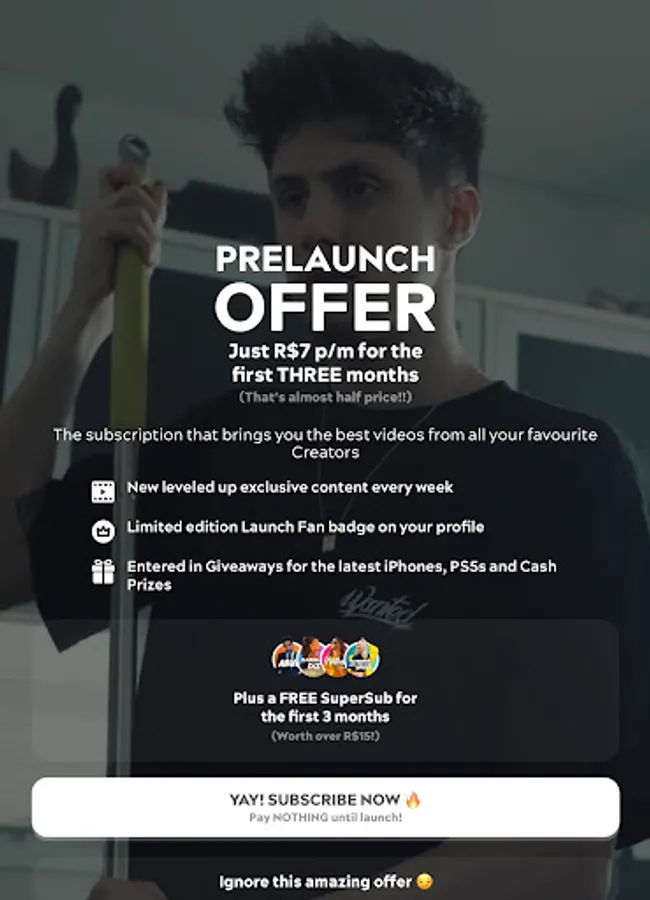 Get the subscription that brings you the best videos from all your favourite Creators with new leveled up exclusive content every week and the opportunity to be entered into Giveaways for the latest iPhones, PS5s and Cash Prizes.