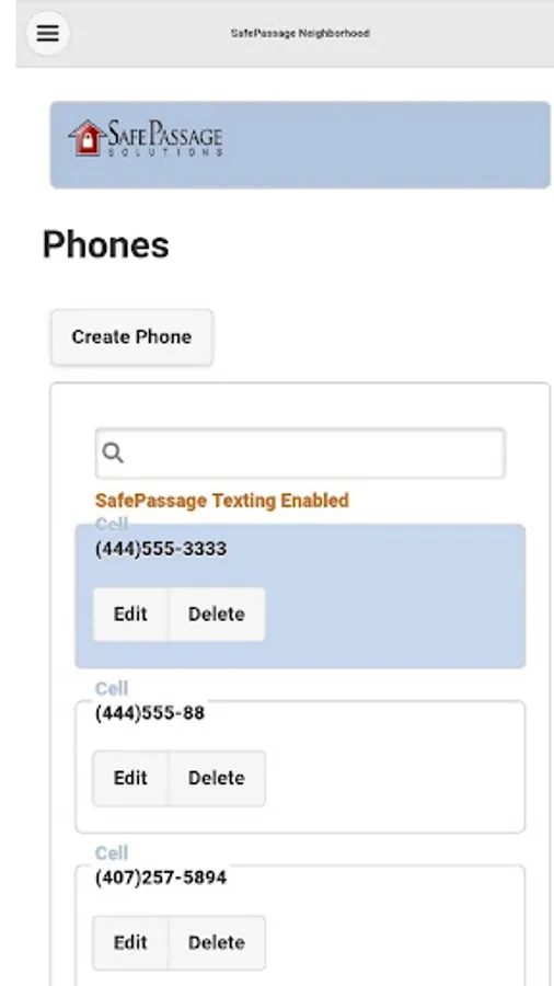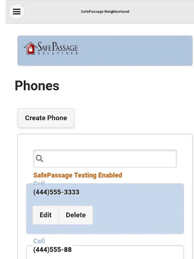 Users are able to add, update and delete phone numbers that can be used for contact purposes. Users can also use this feature to specify which phone number can receive text messages via the SafePassage service.