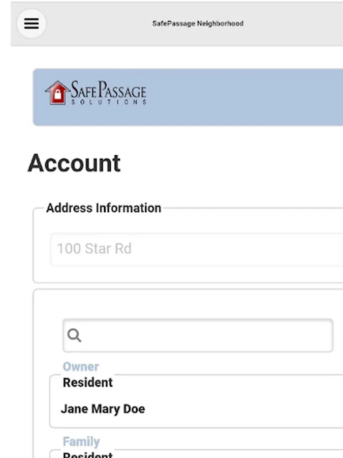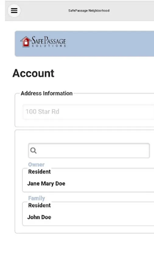 This allows the user to see their account information obtain by the SafePassage system. This will show all listed residents and their associated address.