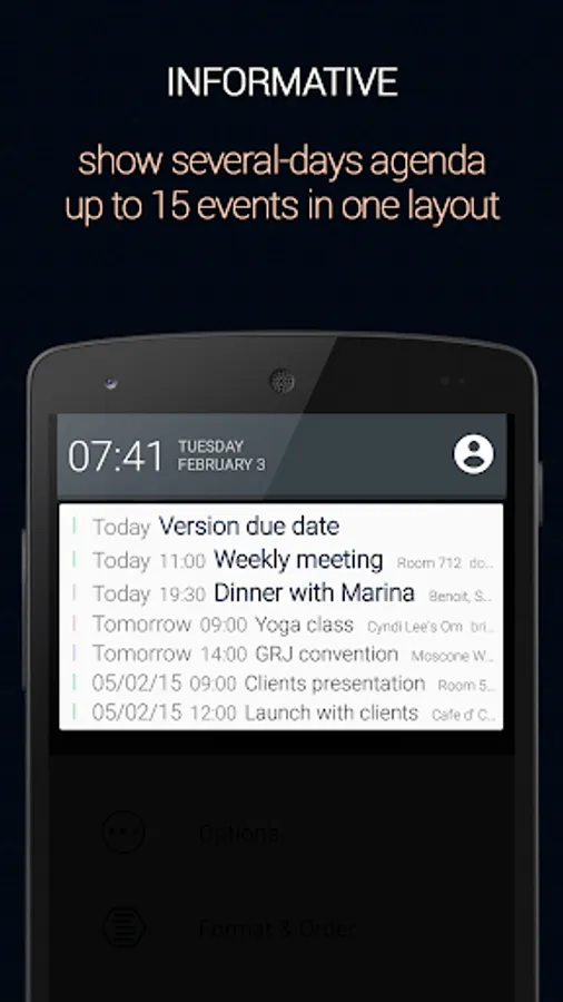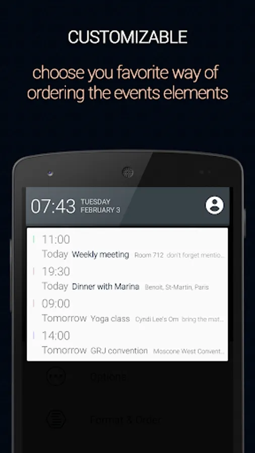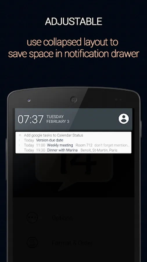 Calendar status places your agenda on your notification drawer, providing easy and quick access to your agenda from any app and any screen.