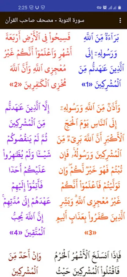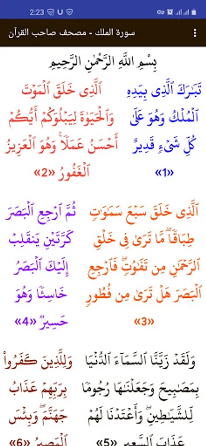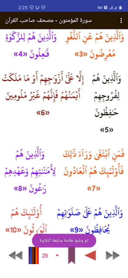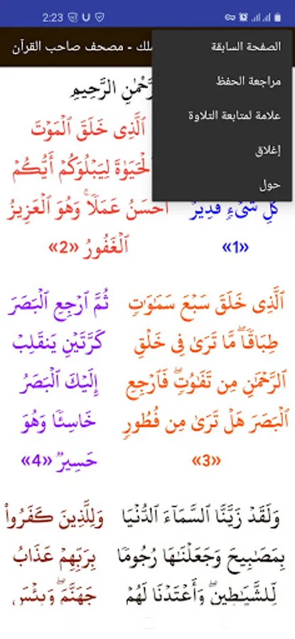 طريقة جديدة للمعاونة على حفظ القرآن الكريم وذلك بمراجعة عشر آيات في كل صفحة بإخفاء الآيات العشر وظهور رقمها بدلاً منها وذلك بالضغط على المفتاح متعدد الألوان أسفل الصفحة (أو مراجعة الحفظ من القائمة) ثم الضغط على آية آية لإظهارها بعد تذكرها