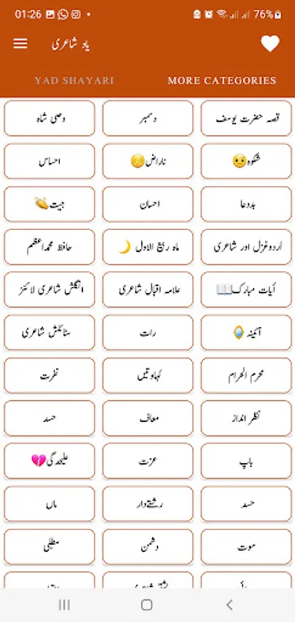 Good Morning, Night, Zindgi, Ghum, Tanhai, Zid, Dhoka, Badnam, Wqt, Islami ,Mosam, Yad, Birthday, Wada, Dosti, Zakham, Humsafar, Judai, Ishq, Nafrat, Chaiy, Eid, Dua, Mout, Zamana, Dill etc