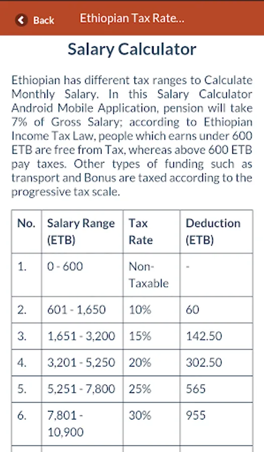Salary Calculator is a simple Income calculator for Ethiopian income tax. As an Employee you can use our Salary Calculator tool to get a clear idea of how much you'll earn after tax. As an Employer, determining what to pay your employees doesn't have to be a need always to contact an Accountant . When it comes to the exact amounts you should pay, use our Salary Calculator for free.