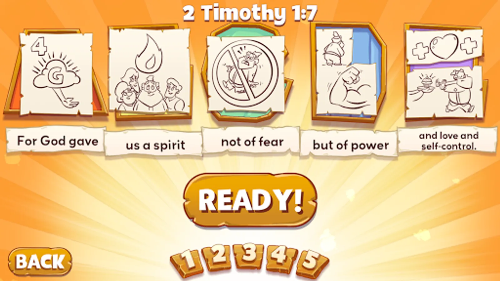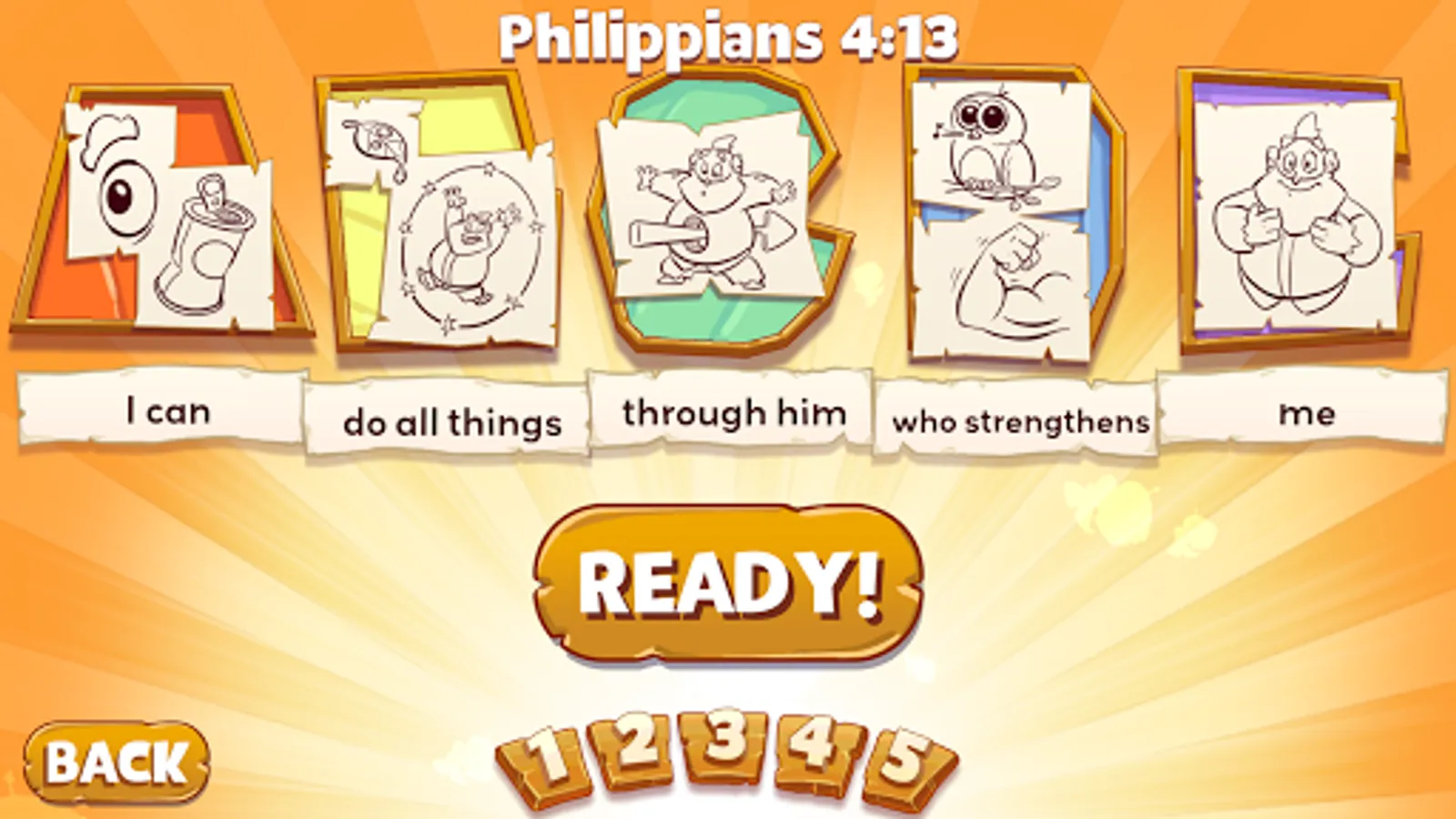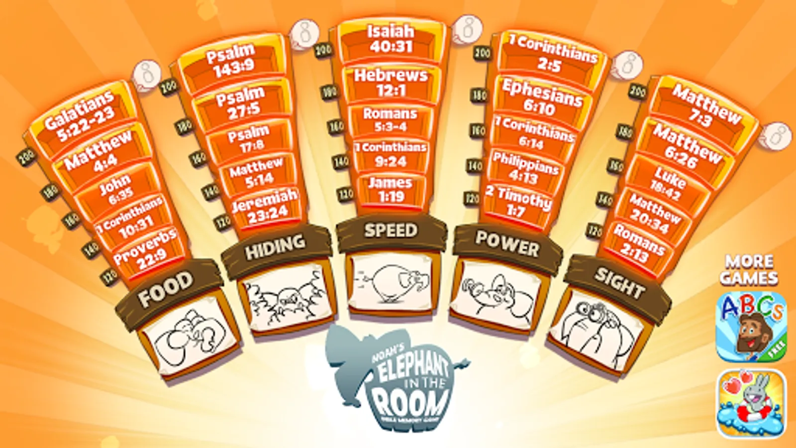 Join Noah, his sons, and a bunch of ark animals as you learn 25 Bible verses from the Old and New Testament! Each verse runs through 5 stages of increasing difficulty allowing the player to process and store each verse into long term memory.