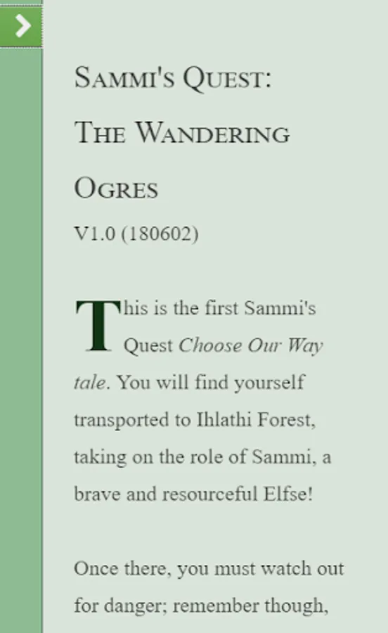 In this 12000+ word Choose Our Way tale you guide the Elfse Sammi through the story, Sammi's Quest Volume 1: The Wandering Ogers.