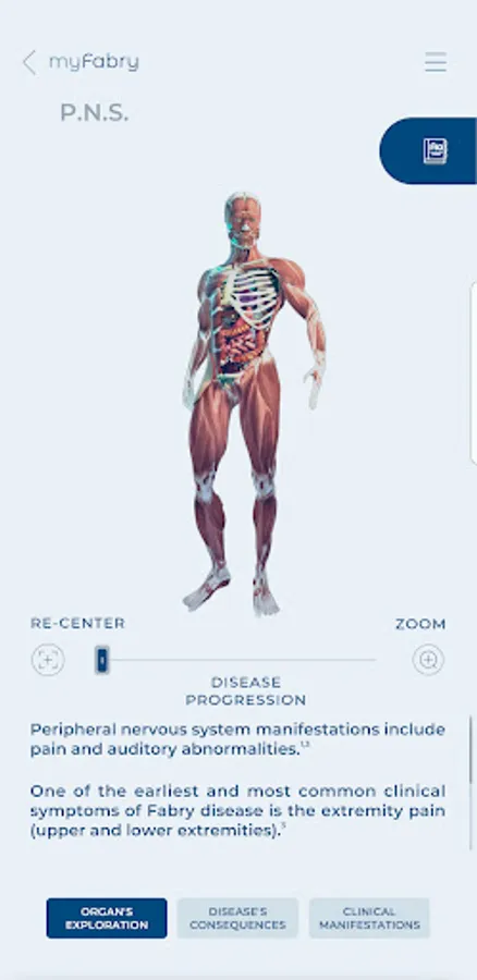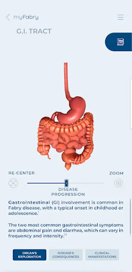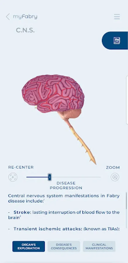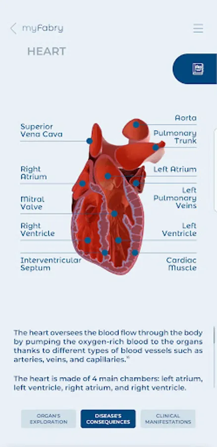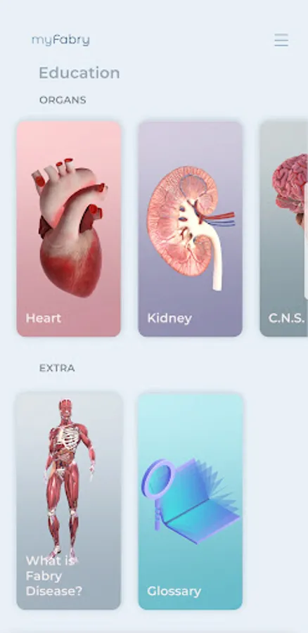 Visualize the human body through a wide range of educational content with 3D modeling. Learn more about Fabry disease and discover the potential progression of the disease within the organs. Using the glossary, familiarize yourself with medical terms.