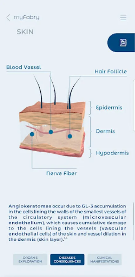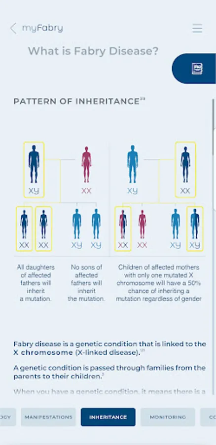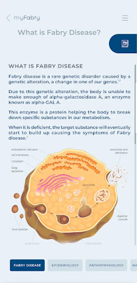 The myFabry App is designed to help people with Fabry disease to better manage their disease in their daily lives. This app can be used to learn more about Fabry disease, easily track the evolution of symptoms and facilitate better patient-doctor communication.