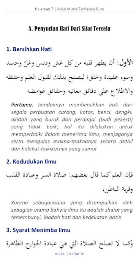 First, it should cleanse the heart of all acts of cheating, dirty, hate, envy, bad faith and bad character; this is done to improve in receiving knowledge, guarding it and reviewing its meanings in detail and its vague essence.