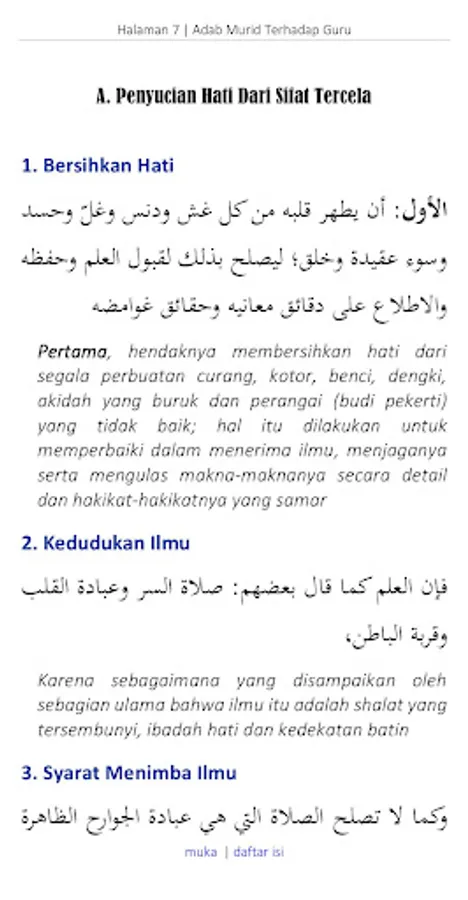 - Requirements to Gain Knowledge: As it is not justified (invalid) to pray which is the worship of a real limb except for physical purity from hadats and uncleanness, so it is the same with knowledge, which is a worship of the heart, so it is not permissible to gain it except in a state of purity from bad qualities, bad and despicable morals.