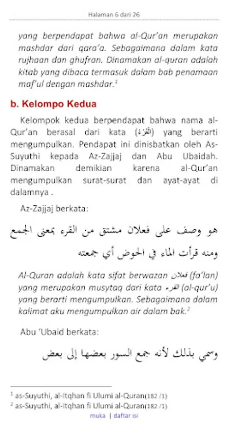The first group argues that the name of the Qur'an comes from a word which means reading. So in this case the naming of the Qur'an enters the chapter on naming maf'ul with mashdar. This opinion was attributed by As-Suyuthi to Al-Lihyani and others.