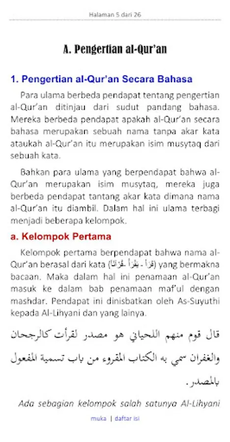 Scholars differ on the meaning of the Qur'an from a language perspective. They differ in opinion whether the Koran in language is a name without a root word or whether the Koran is a musytaq term of a word.