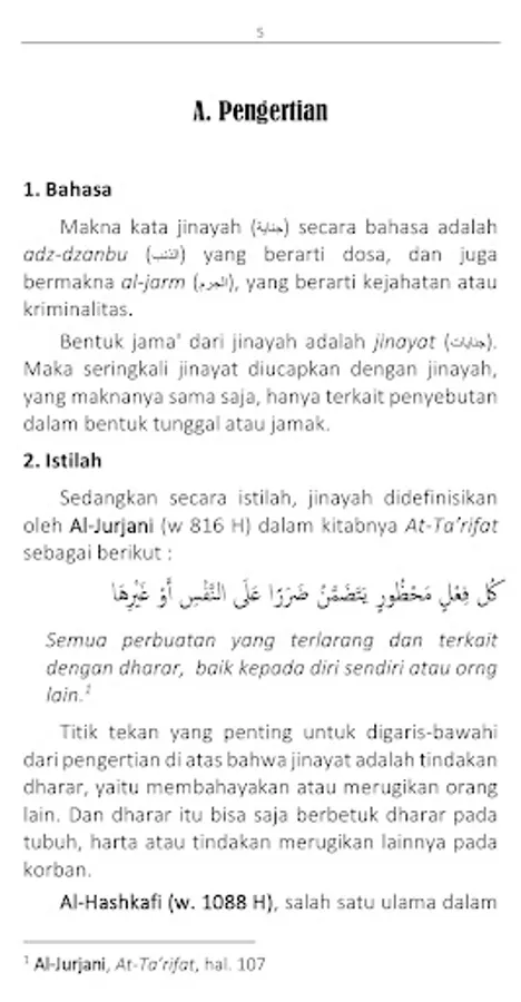 Meanwhile, in terms, jinayah is defined by Al-Jurjani (w 816 H) in his book At-Ta'rifat as follows: