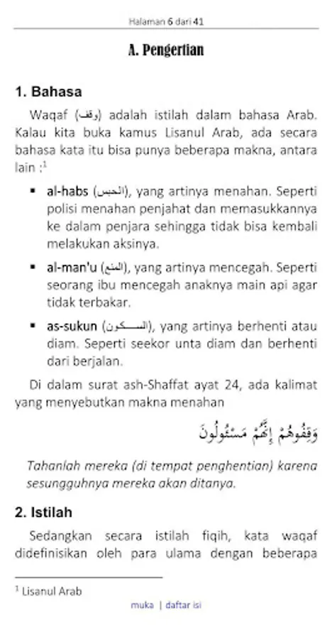 Waqf is an Arabic term. If we open the Lisanul Arabic dictionary, there are language-wise words that can have several meanings, including: