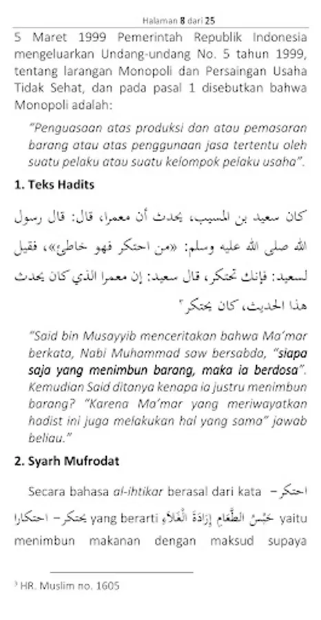 This simple article is structured to briefly explain among the basic principles of Islamic economics which are excavated from the hadiths of the Prophet Muhammad. And among these principles are; prohibition of monopoly in the economy, prohibition of cheating and cheating, and collective contract agreements.