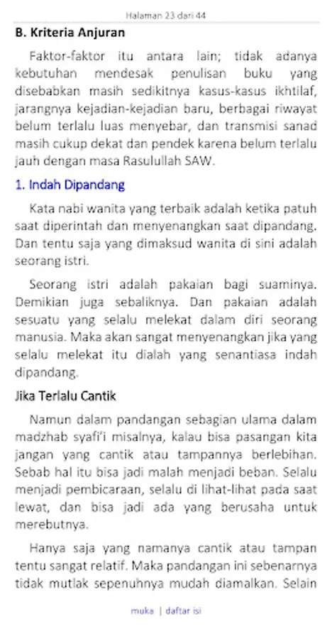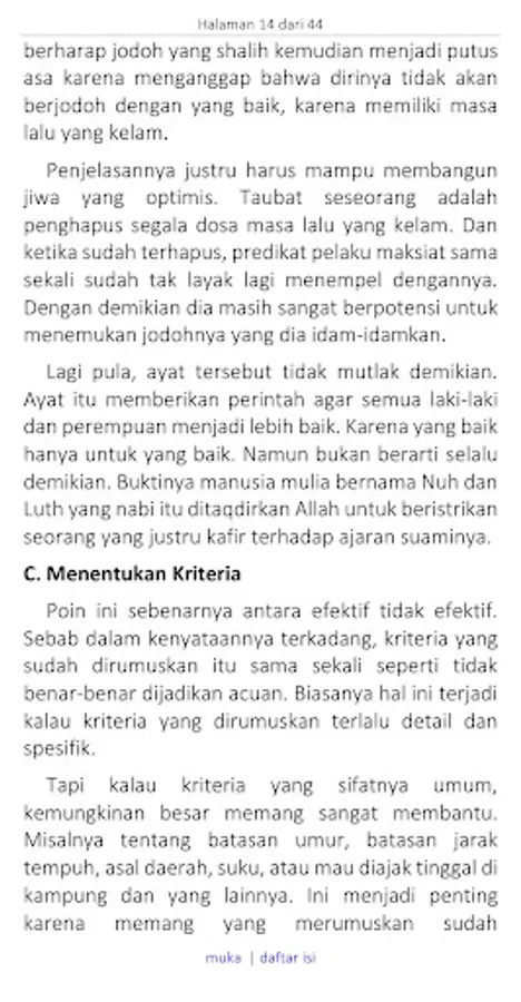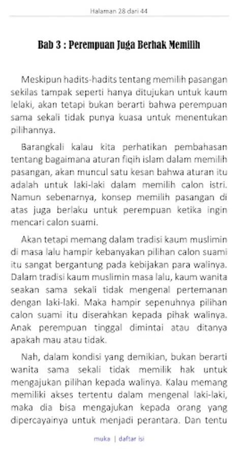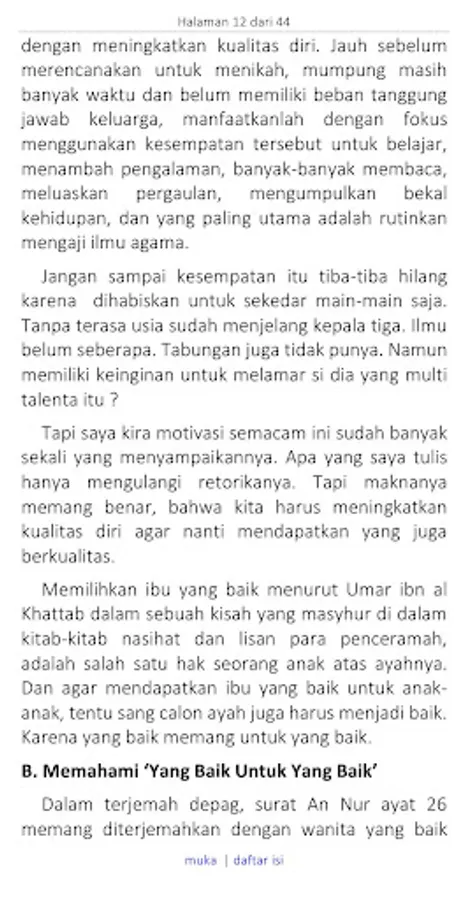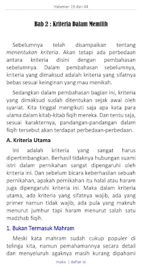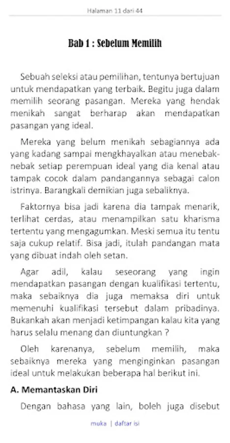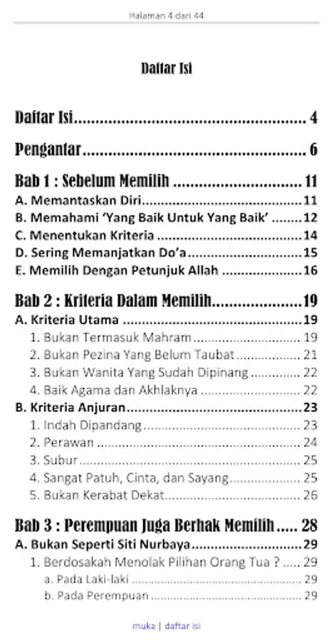 This Android application is an explanation of the intent of not taking the wrong step in choosing a legal partner by Sutomo Abu Nasr. In PDF format.