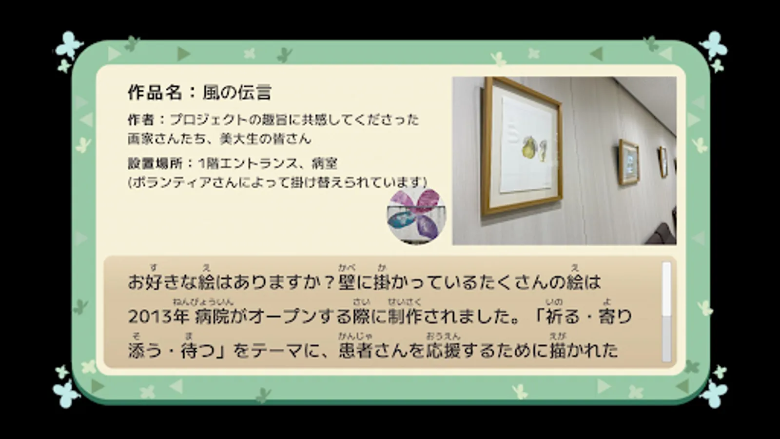 It is an AR application of the National Hospital Organization Shikoku Children's and Adult Medical Center. Every year, I have been painting a mural of butterflies with graduates of the adjacent Zentsuji School for the Handicapped. In this app, the butterflies that have been drawn so far fly away into the sky. Also, by tapping the butterfly, you can see the explanation of the art in the hospital.
