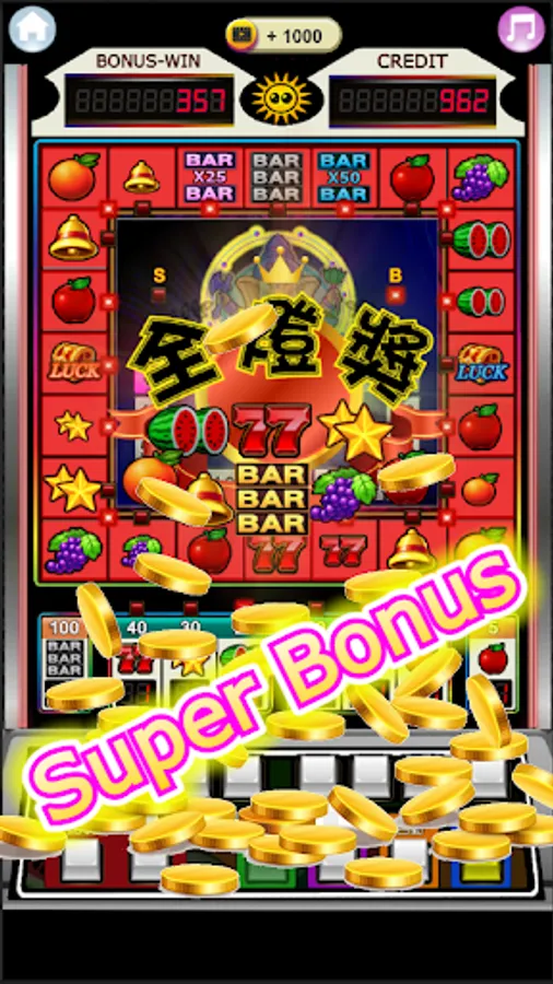 This machine has apples, oranges, grapes, bells, watermelons, double stars, 77, BAR