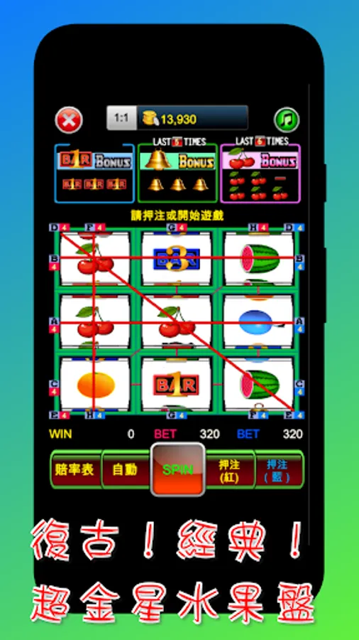 The main gameplay is the 3x3 retro fruit plate, which can be fully displayed up to 16 lines, with a maximum of 99 bets per line!