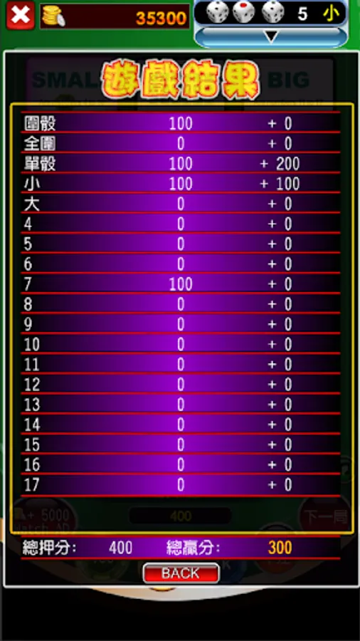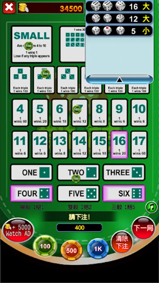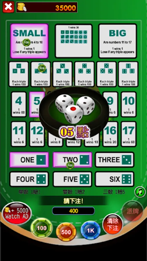 In addition to the categories mentioned below, some casinos can also bet on singles, doubles (calculated by the addition of three points), specific three points of any three dice, etc.