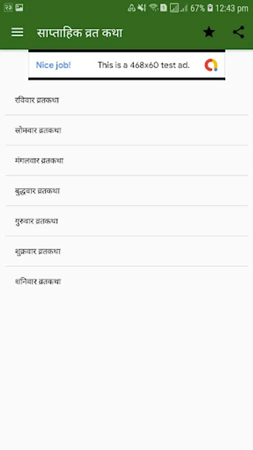 ravivaar vrat katha, guruvaar vrat katha, shanivaar vrat katha,Saptahik Vart Katha in Hindi (साप्ताहिक व्रत कथा) weekly vart Katha in Hindi .There is a complete collection of Saat Vaar Vrat Katha and Pooja Vidhi, Vrat Katha and Seven days Vrat Katha(stories) with aarti in Hindi. Fasting (fasting) is a way of showing our beloved God. During fasting we should read / listen to the mythological story related to that day. In this app we tried to include the fast according to each Days.