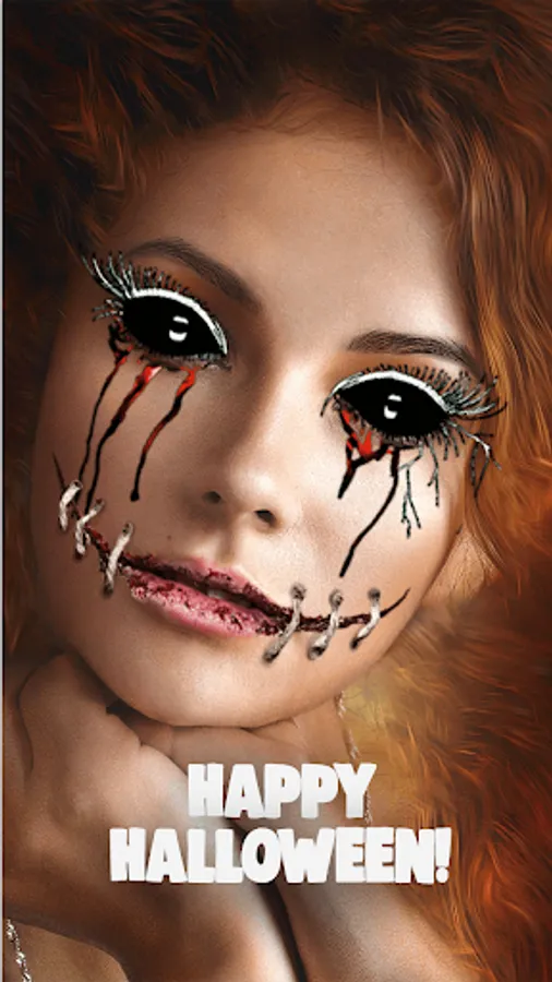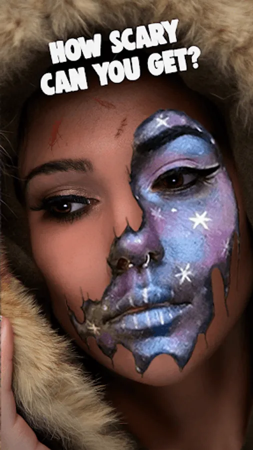 Scary Photo Editor Horror is a must have for this Autumn! Explore the scary filters for selfies: scary doll eyes, black eyes effect, gas mask filter, skull mask, zombie clown face and many more! A scary masks horror pic editor is great if you want to scare your friends and add scary photo montages on your social profiles! Try scary evil clown eyes or crazy cat masks! The original horror mask photo editor free download has it all! From horror eyes and stickers calavera to carnival makeup or zipper face torn in half! Do you dare try on half face makeup from this horror sticker camera?
