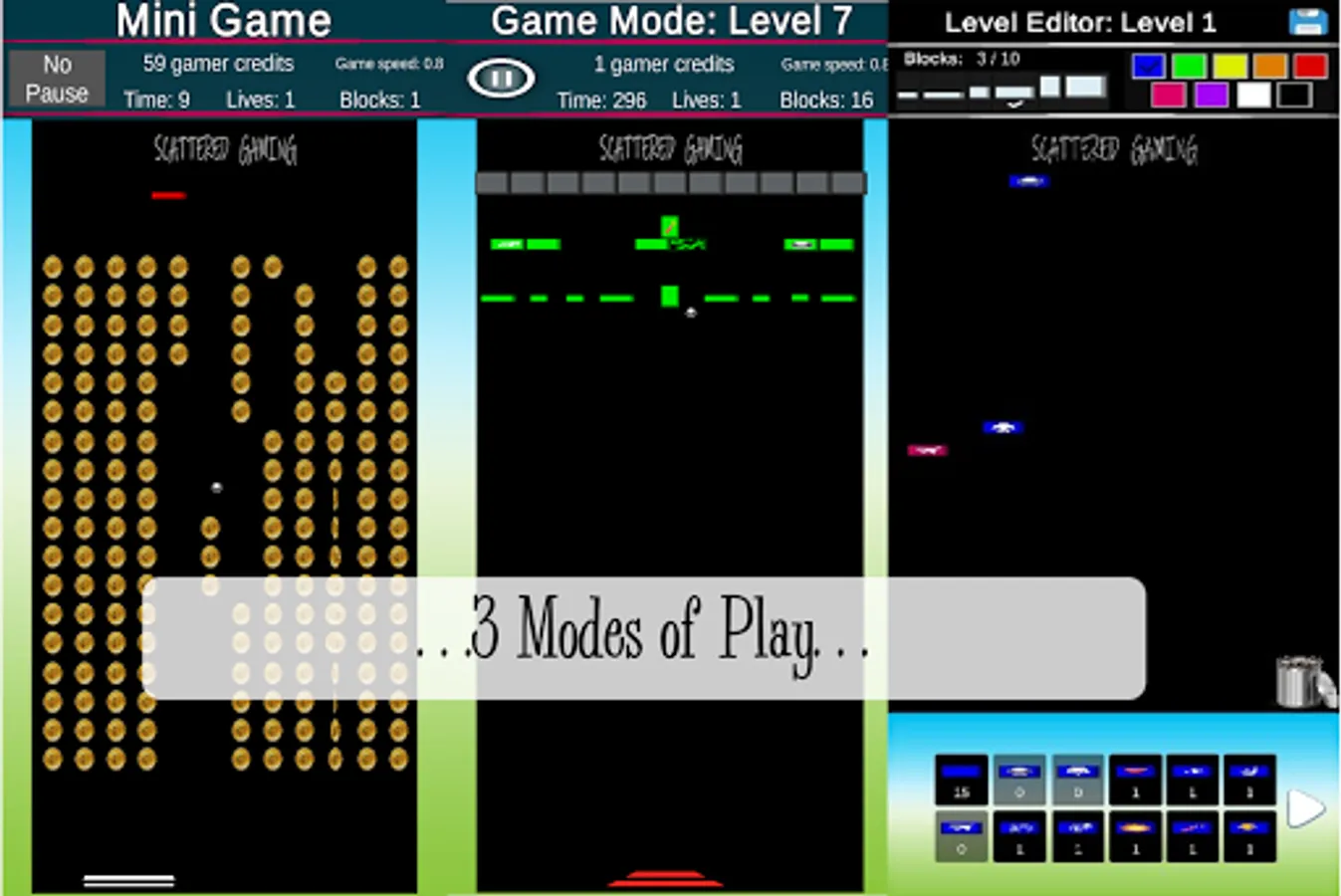 In Game Play Mode, you control the paddle to try and break all the blocks with the ball, while trying to earn enough gamer credits to earn 3 stars.