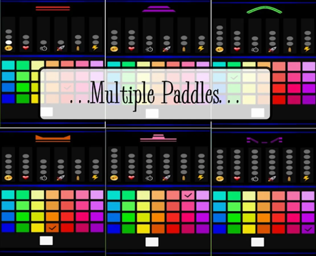 Brick Break-Ultimate Arkanoid has 6 different paddle shapes with 28 colours. Each paddle allows you to control the way the ball bounces, by hitting the ball on a certain point on the paddle. There is also a never before seen paddle, called the 'Pinball Paddle', that is waiting for you to unlock and use. π