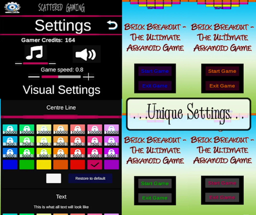 Brick Breakout - The Ultimate Arkanoid Game has been modernised with levels having a 3 star system. Some blocks have power ups and bonuses which fall when broken free. Be careful when you are catching a falling item (not all of them are good). You can change the colour of the layout in the game in the Visual Settings. There's a lot you can change, try it all out.