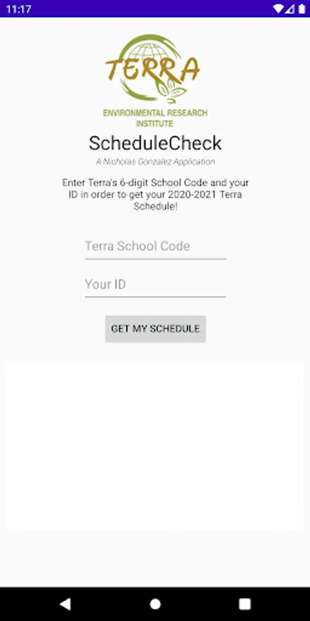 Find, save, and share your class schedule for the new school year using ScheduleCheck! Simply input your School code and ID number, and ScheduleCheck does the rest! Schools currently using ScheduleCheck: Terra Environmental Research Institute.