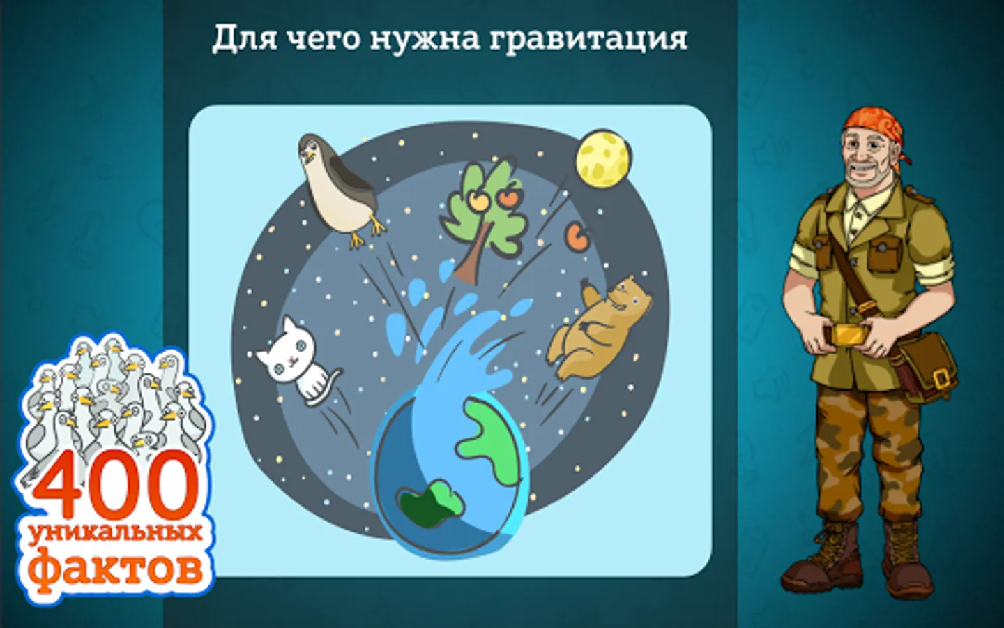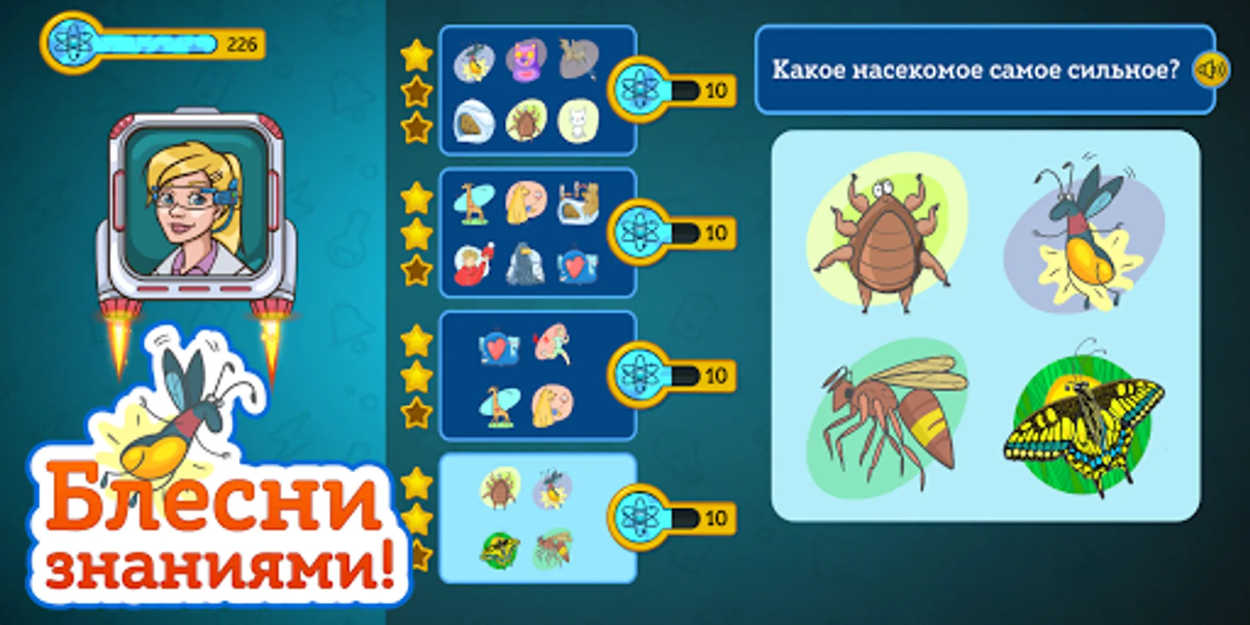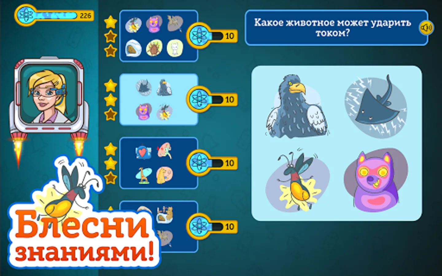 Each topic contains cards with scientific facts voiced by Nikolai Drozdov. Discover and find out why a firefly glows, where crystals are born, who is able to survive in outer space, from where you can see 15 sunsets a day, why bats in the dark do not crash into trees, how snowflakes sing, and much more.