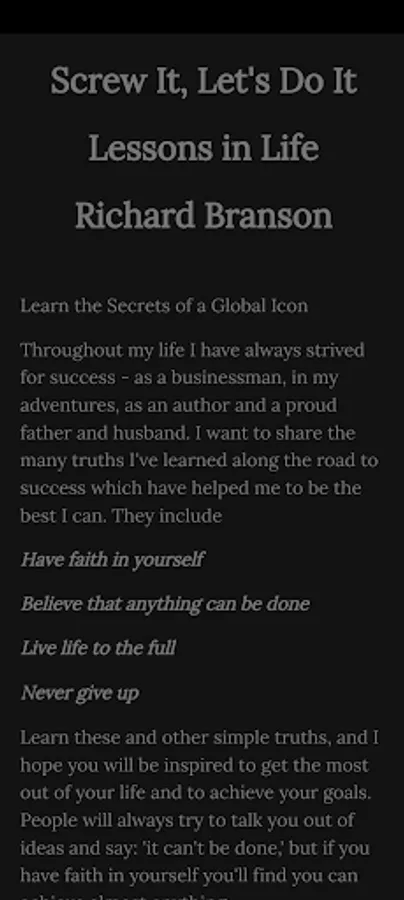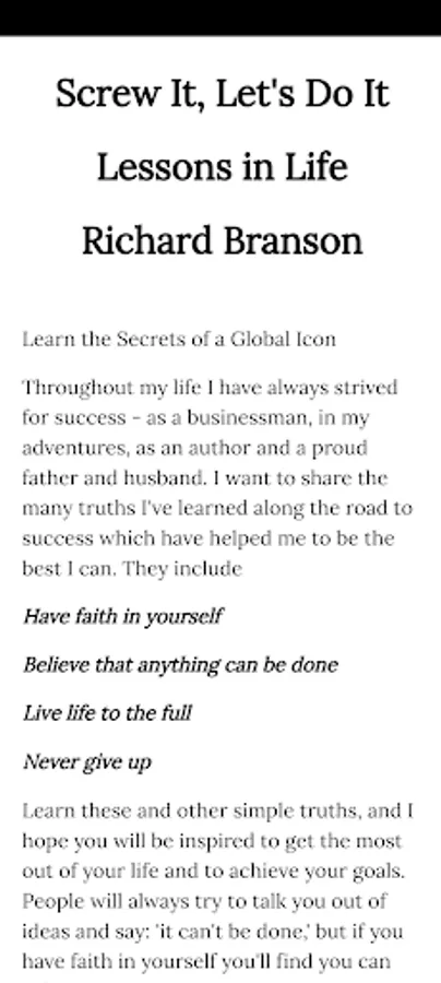 Global entrepreneur Sir Richard Branson has built a business empire and made billions, yet is renowned for his approachability, ability to challenge and succeed against the odds. Screw It, Lets Do It reveals the lessons from life that have helped him through his business and personal life such as, believe it can be done and that, if others disagree with you, try and try again until you achieve your goal; or that you must love what you do. These and other lessons, with examples of how he learned them and how hes used them, are included in this stirring and candid look at his lessons from an exceptional life, which will inspire you to make a difference in your own life.