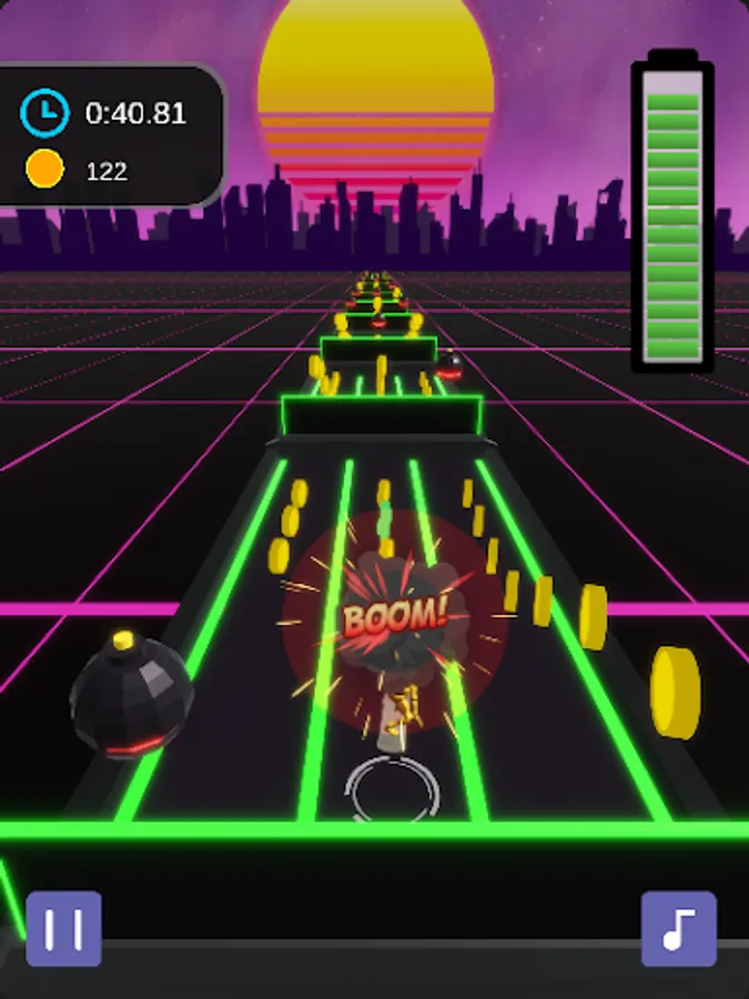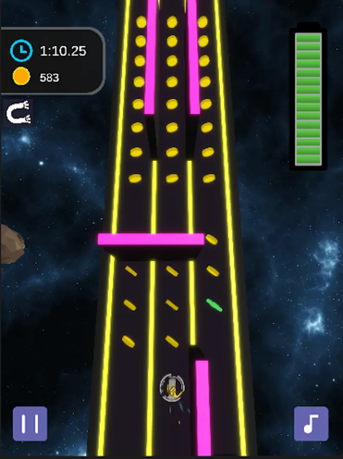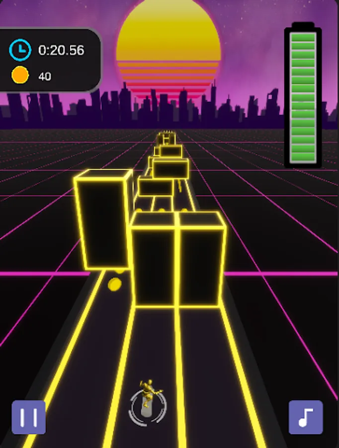 As you play, the game slowly speeds up and cycles through different phases that will change your camera angles and playstyle. You'll collect coins, magnets to pick up nearby items, and energy packs to restore your health. Use these coins to unlock new maps, and customize your hoverboard design, jumping emote, and riding style.