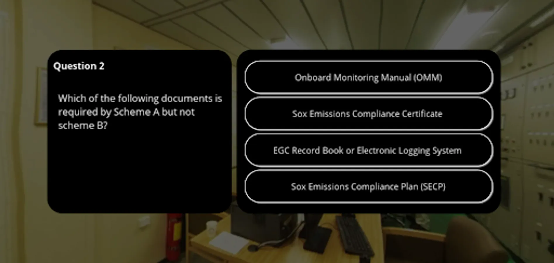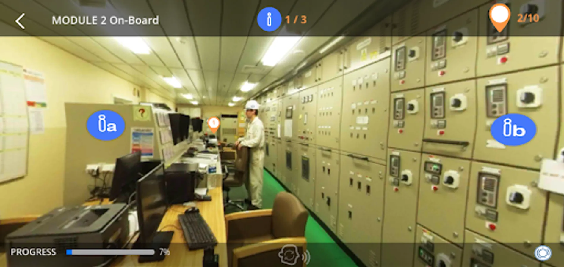 Our bespoke training is developed by veteran professional maritime educators. Take a VR tour through the ship, learn about the systems in detail and take assessments to review what you've learned!