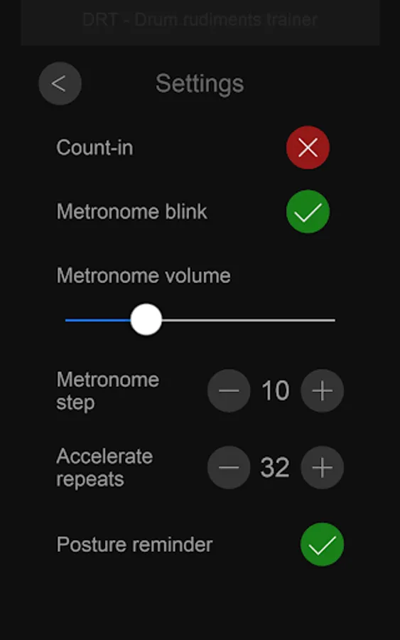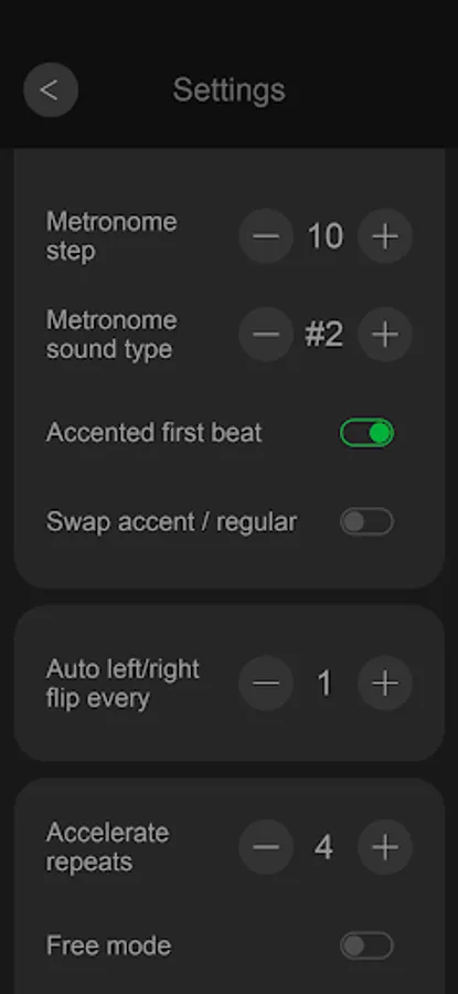 - Metronome sound and visual blink option with individual volume control