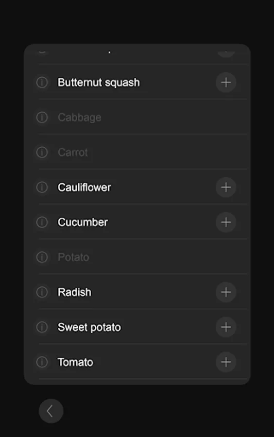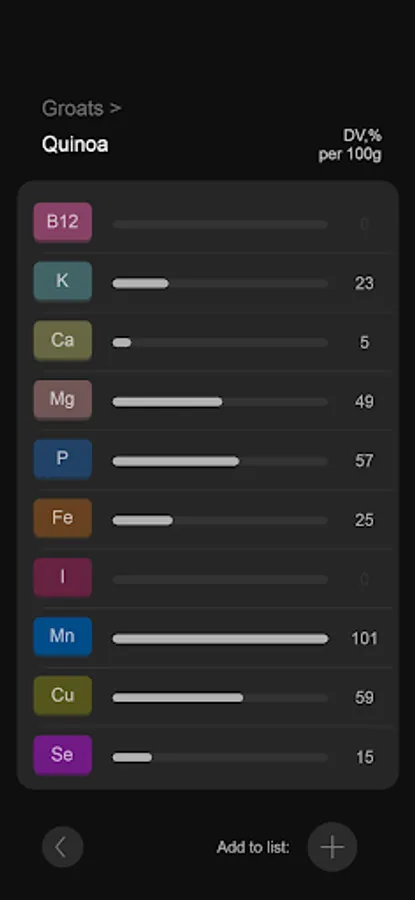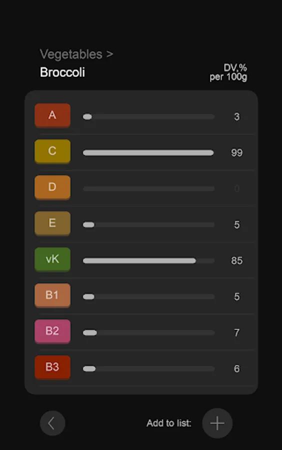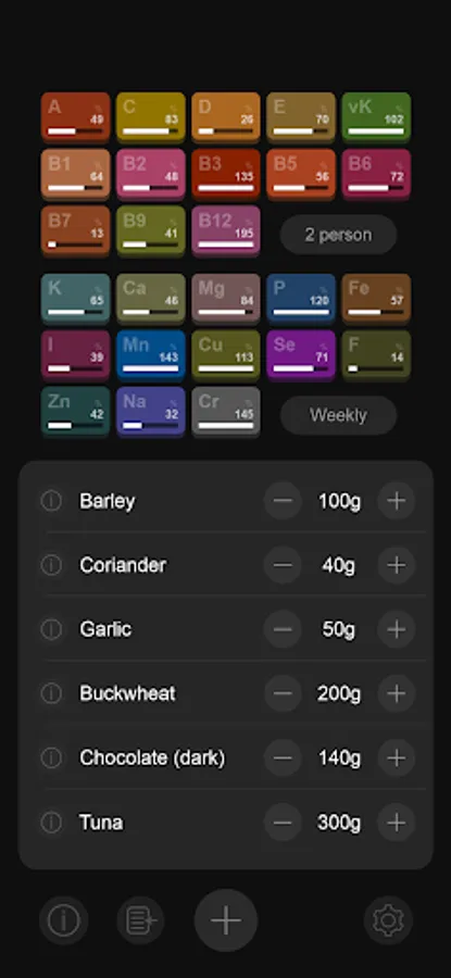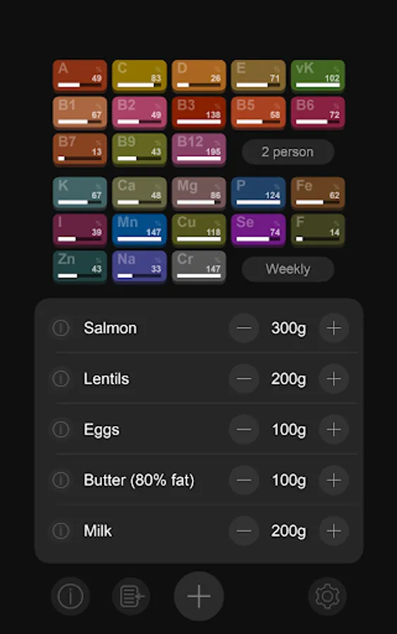 Add foods to the general list to see how well balanced your diet is. Adjust the amount of food consumed (available in grams, kilograms, ounces, pounds) to achieve the right balance and avoid any vitamin or mineral deficiency in your diet plan.