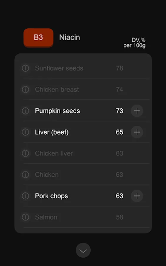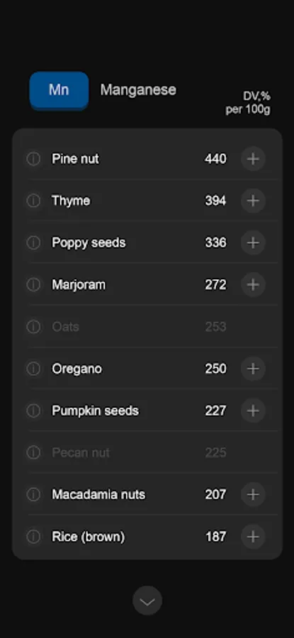 There is also information on the content of micronutrients in foods, in which foods there is more or less of a particular vitamin or mineral. The scales show the daily value of trace elements in the selected food product.