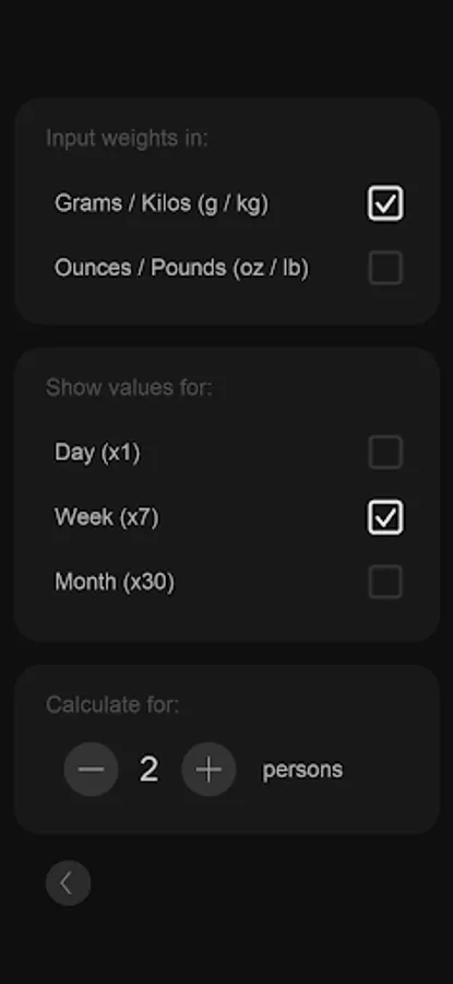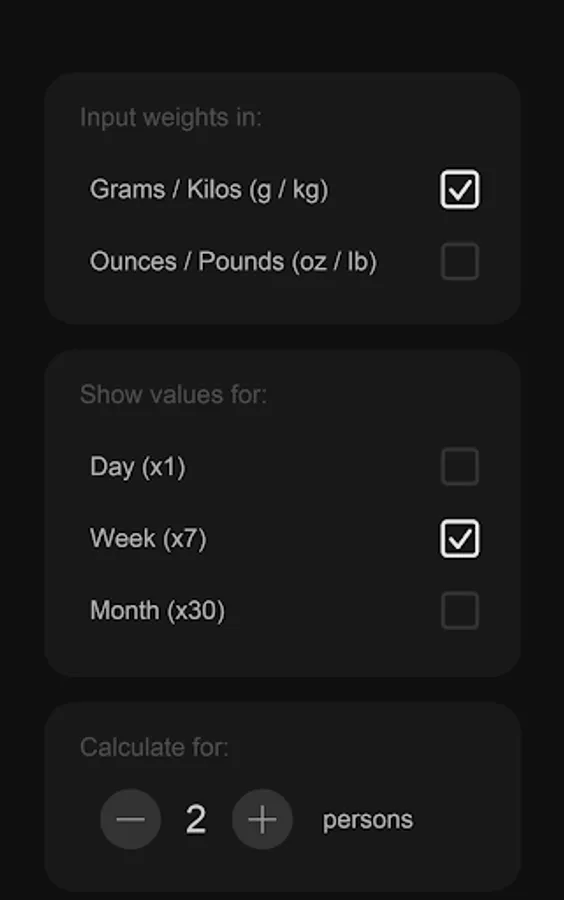 You can adjust the indicators by the number of people and by the number of days of eating.