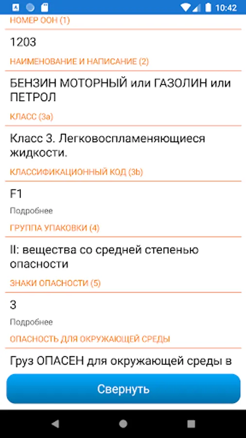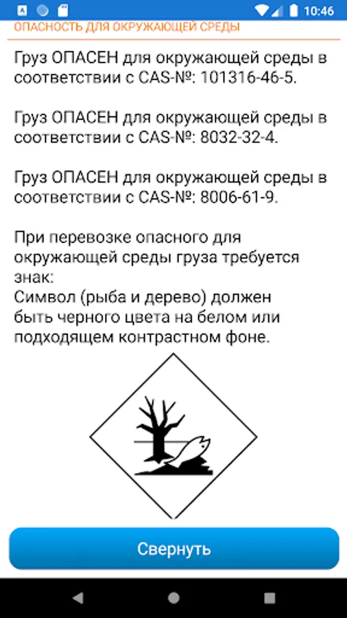 For the selected dangerous goods, information is displayed from Table A and the vehicle equipment requirements for ADR and TR CU 018/2011. For a number of UN, CAS numbers are indicated on the basis of which the hazard of the cargo to the environment and the need for an appropriate sign during its transportation are determined.