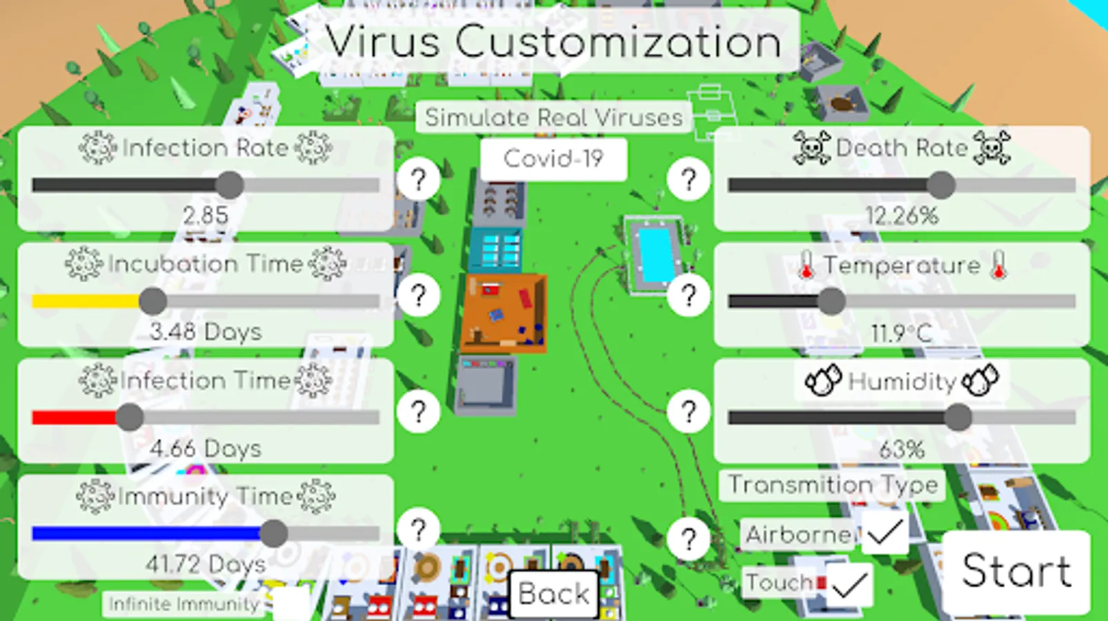 Customize incubation time, infection duration, immunity periods, climate, humidity, and transmission mode to design your ideal virus.