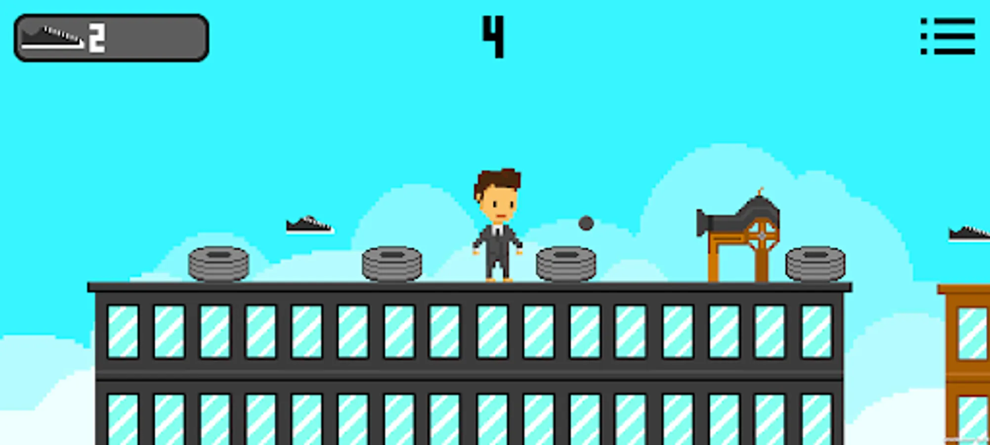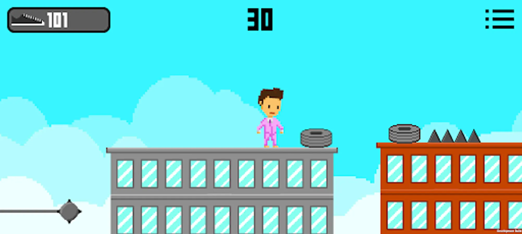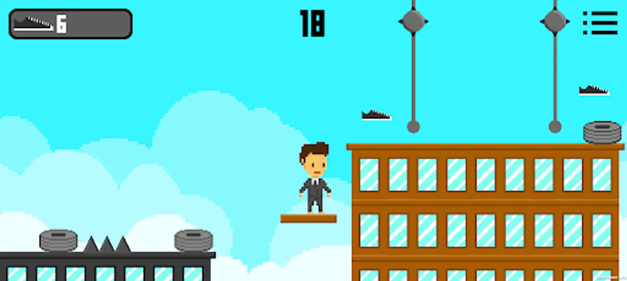 As you advance, you will need to dodge various obstacles and avoid falling from the rooftops. As you dodge the obstacles, you can collect shoes so that you can customize your character with the 8 different suits available. The character is controlled by the rotation of your phone (using the gyroscope), if your phone is rotated to the right, it will turn right, if it is rotated to the left, it will turn left, and if your phone is straight, then the character will stand still.