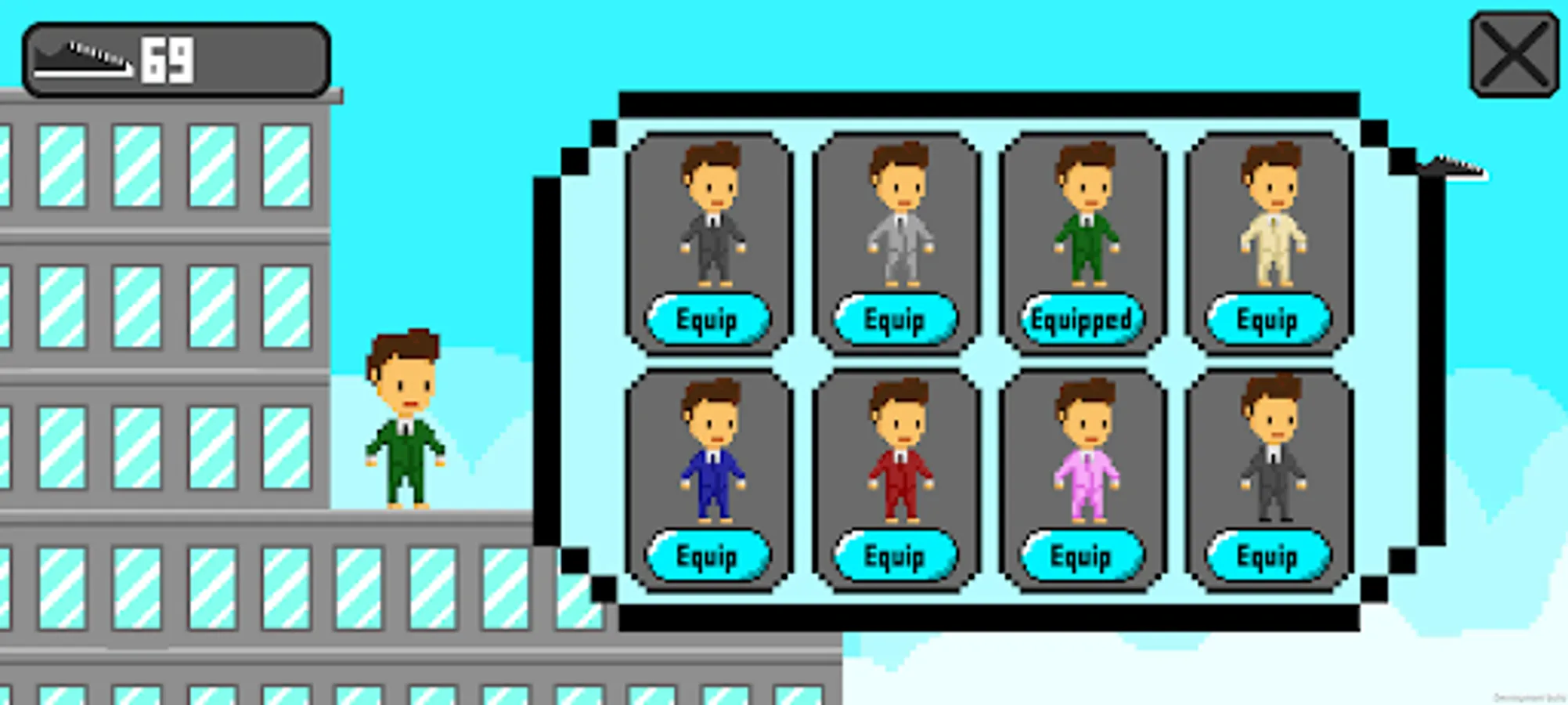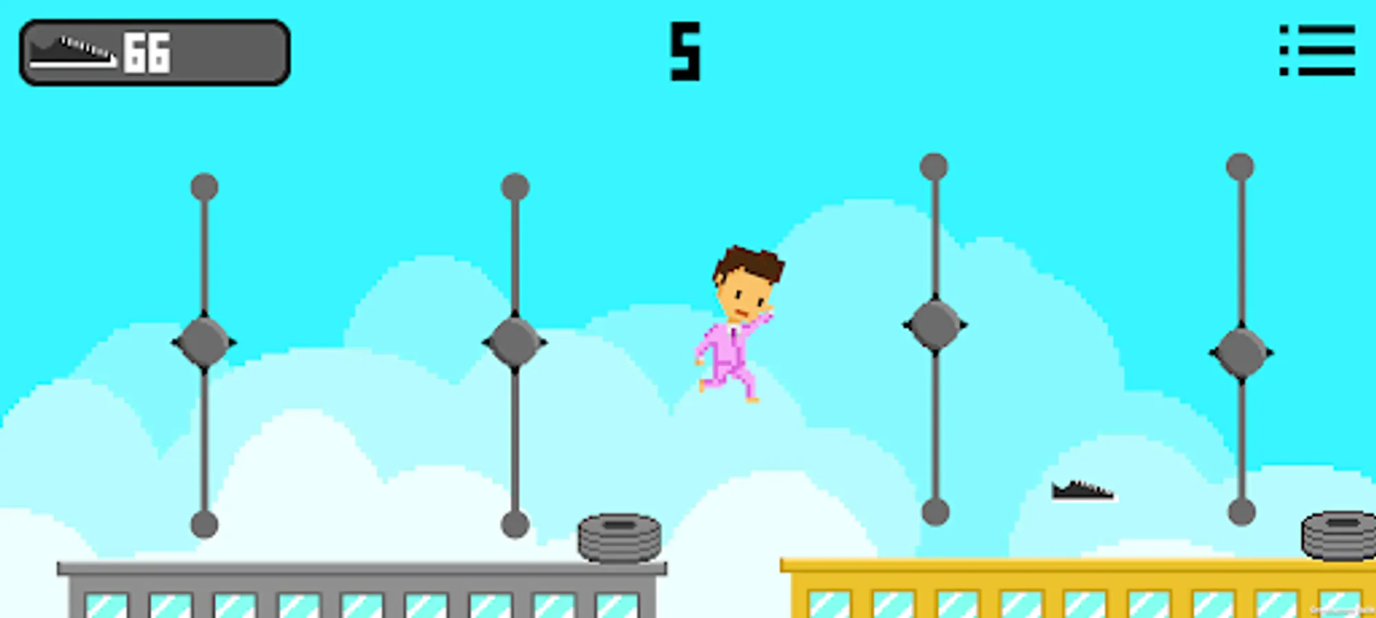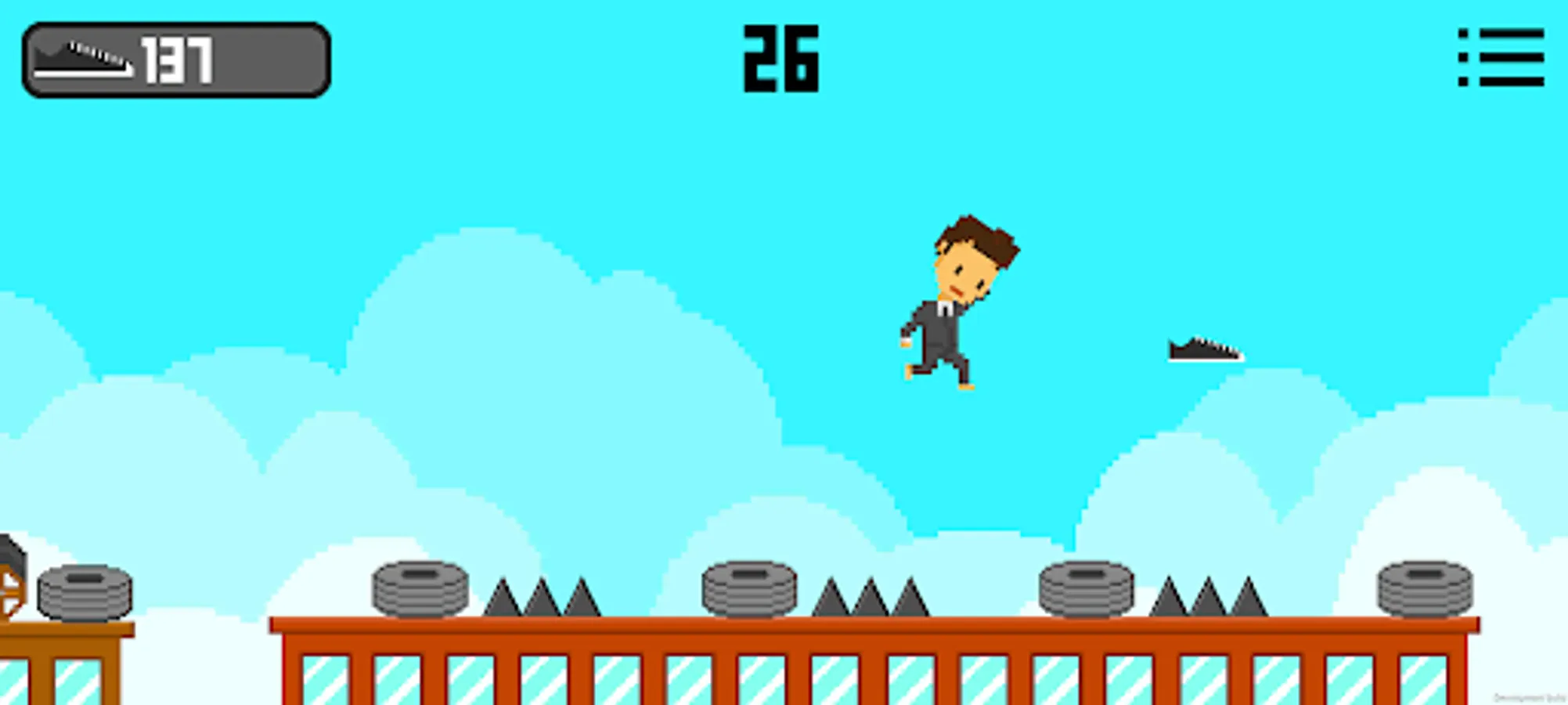 As you advance, you will need to dodge various obstacles and avoid falling from the rooftops. As you dodge the obstacles, you can collect shoes so that you can customize your character with the 8 different suits available. The character is controlled by the rotation of your phone (using the gyroscope), if your phone is rotated to the right, it will turn right, if it is rotated to the left, it will turn left, and if your phone is straight, then the character will stand still.