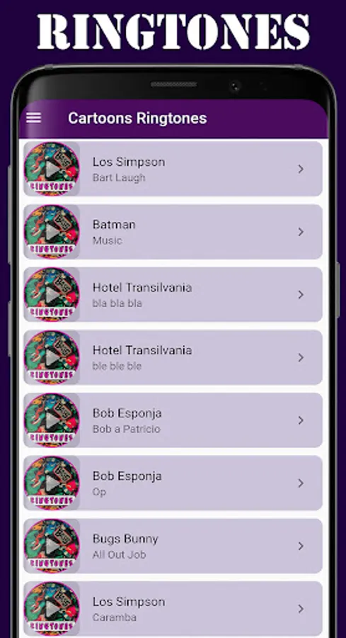 Quickly browse through hundreds of sounds of animated cats, our app is used to configure whatsapp cartoon tones, cartoon sounds are available, you can create unlimited donald lists, use it as cell phone ringtones so you can be attentive in the place in which you are. Don't forget to keep it in mind as a cartoon alarm so you can start the day with the best energy of princess tones and sounds, share with your friends on social networks. Download and fully enjoy the best cartoon app for wpp android. You have the option to choose between bart ringtones whenever you want. This application allows you to customize homer tones for android cell phones, select your favorite cartoon tones for alarms, call sounds and message notifications, since they are all in high quality and totally free, download cartoon tones sounds for whatsapp. What are you waiting for to download cartoon tones? for your cell phone, which will meet your expectations. You should know that this is an application with an internet connection, with incredible sound quality and the best thing that it is completely free.