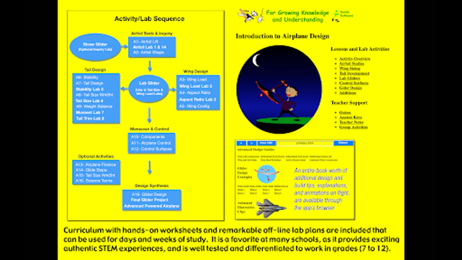 The app includes lessons, numerous activities, and plans for off-line labs packaged as embedded PDF’s which can be used in classroom settings to keep students actively involved with the software, give students the opportunity to test aerodynamic principles using a wind tunnel simulation and flying test aircraft, and help them to understand how to design their own aircraft that fly well. These lessons can free up more time for you to teach!